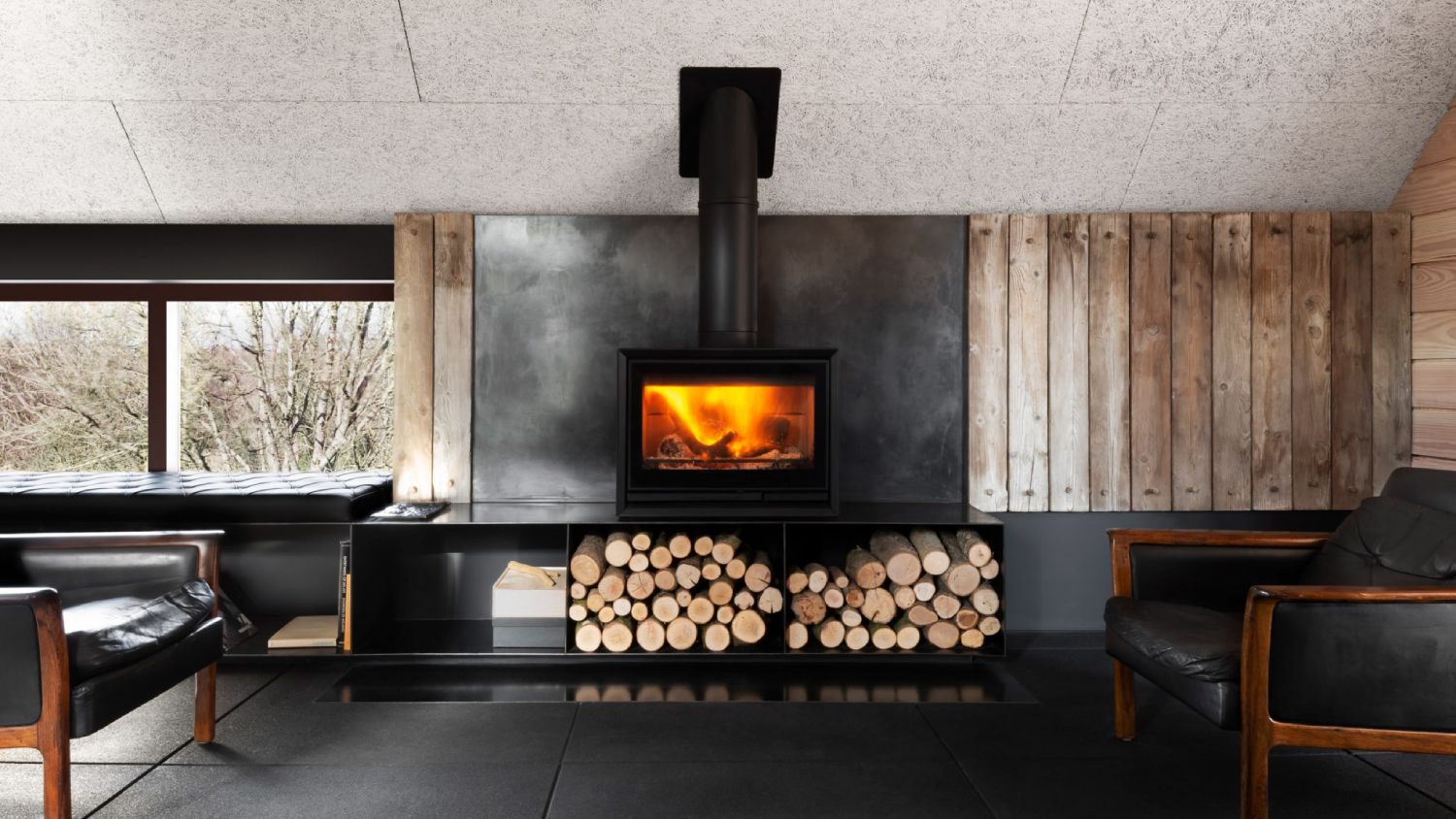 Zid na kom se nalazi peć na drva, obložen je drvetom izvađenim iz obližnje seoske kuće u kojoj je nekada živeo Berthold Lubetkin.