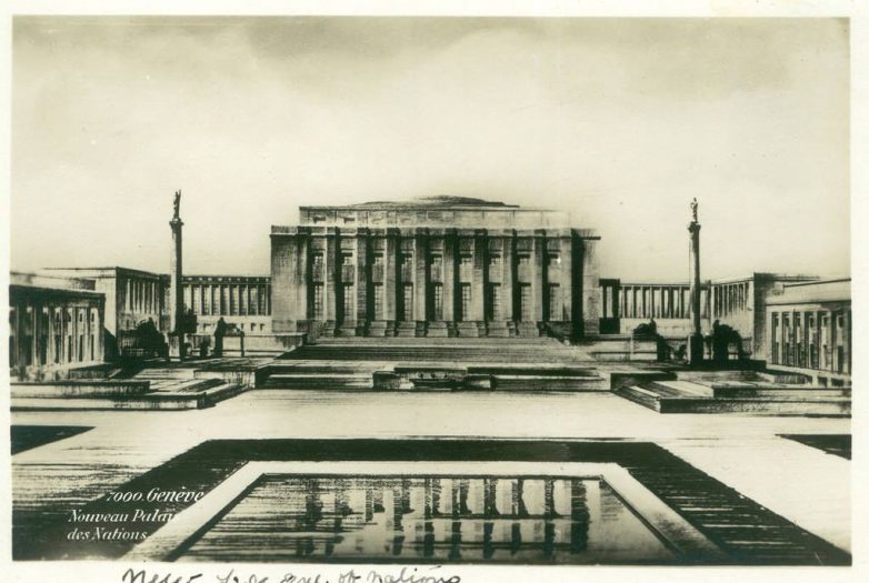 Ova zgrada, locirana na Ženevskom jezeru, očekivano je dobila naziv Palata Naroda, a zidana je od 1929. do 1938. godine. Lokacija u Švajcarskoj, kao sedište Lige, opravdana je vojnom neutralnošću ove alpske države, ali zato dugačak period izgradnje i njena arhitektura nisu opravdale svoje ideje. Sve započinje internacionalnim konkursom, na koji je po rečima jednog od učesnika konkursa – Le Korbizjea, pristiglo 377 radova. Među tim radovima našao se i veliki broj projekata u duhu internacionalne moderne, arhitektonskom izrazu koji je bio najpogodniji da iskaže neutralnost i nadnacionalne ideje koje je Liga postavila za svoje ciljeve. Ali umesto progresivne moderne arhitekture, žiri je odabrao konzervativni, monumentalizovani, akademski projekat, koji je u neku ruku najavio epohu totalitarnih režima u Evropi. Zgrada je jednostavno oslikavala duh epohe u kojoj je nastala, to jest, raspoloženje u društvu koje nimalo nije napredovalo nakon Prvog svetskog rata.