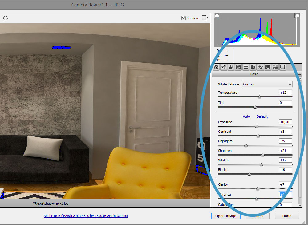 Renderi u V-Rayu znaju da izgledaju pomalo hladno pa ne bi bilo loše da ih malo sredite u nekom od programa za obradu fotografija. Ako imate Photoshop, najbolji način je da to uradite tako što ćete izabrati opciju Camera RAW filter pod stavkom Filter u glavnom meniju. Utoplite render tako što ćete povećati malo Temperature, Exposure, Contrast, Whites i Shadows a smanjiti malo Highlights i Blacks. Detalje možete istaći pojačavanjem Clarity a boje istaći opcijom Vibrance. Jednostavnim povlačenjem slajdera menjate intezitet alatke i pravite ugođaj u enterijeru koji vama odgovara.