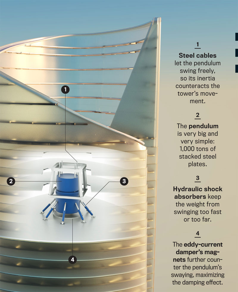 Klasično rešenje za ovaj problem jeste klatno: okačite veliki teret blizu vrha tornja i inercija mase će umanjiti, ako ne i poništiti, vertikalne sile i umiriti ljuljanje. Međutim, tradicionalno rešenje nije skroz efikasno kod megastruktura jer samo klatno postaje problem, piše Popular Mechanics.