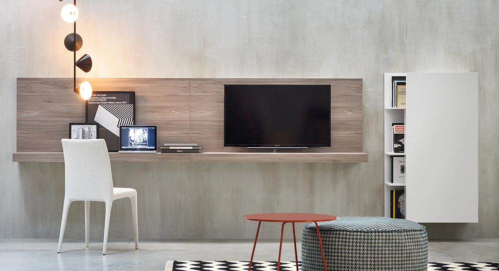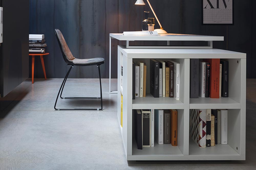 Pojedini modeli radnih stolova služe ujedno i kao police za televizor dok je poluotvorena polica za knjige potpuno odvojena.