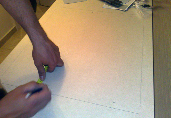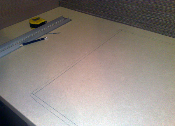 4. Po unutrašnjoj iscrtanoj liniji će biti isečena radna ploča i u ovaj otvor će se postaviti elementi sudopere i električne ploče.