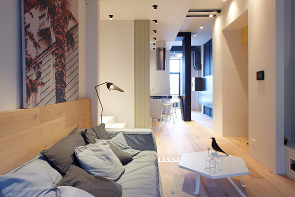 Nameštaj i zidovi su bele boje, koja se preporučuje za male stanove. Polica za TV je obložena keramičkim pločicama koje su korištene i za oblaganje par stepenika koji vode ka spavaćoj sobi i kupatilu.