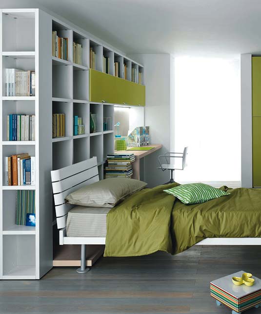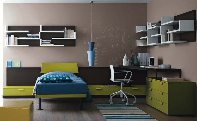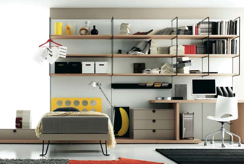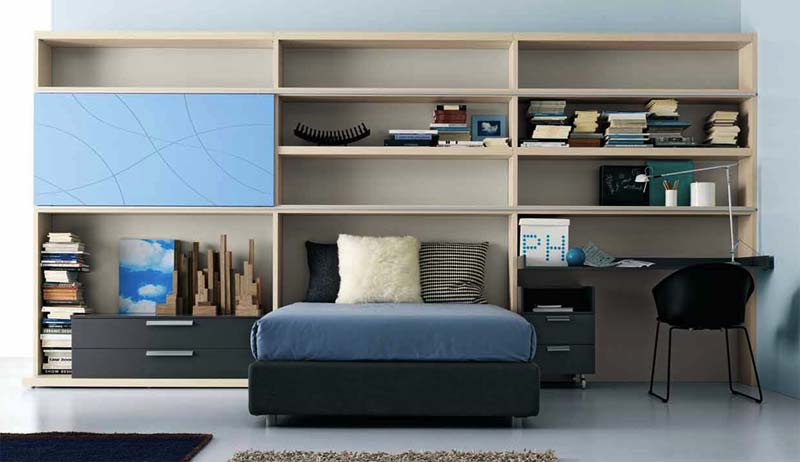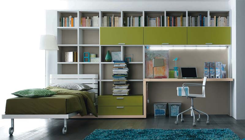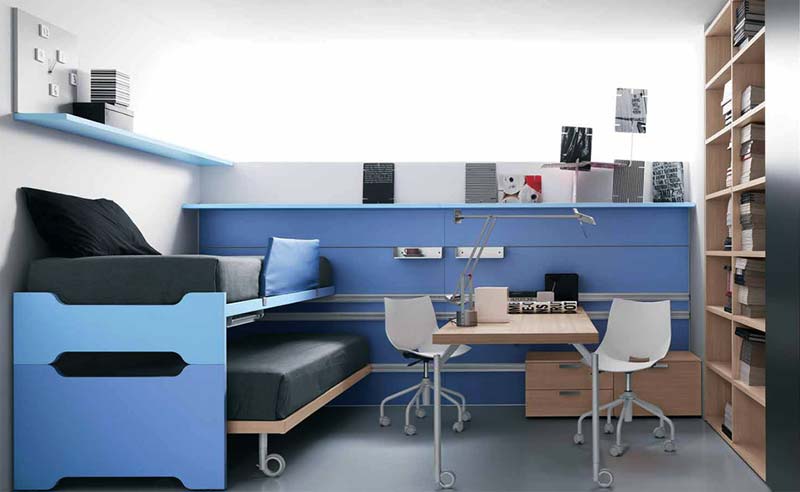 Soba za mlade treba da sadrži dosta mesta za skladištenje kao i prostor za rad. Zanimljivo je rešenje dizajna radnog stola u čije linije prate otvorene i zatvorene police. Ova igra otvorenih i zavorenih formi deluje vrlo interesantno pre svega ako se koriste jarke boje na frontovima.