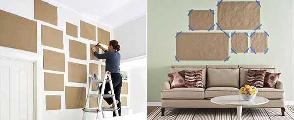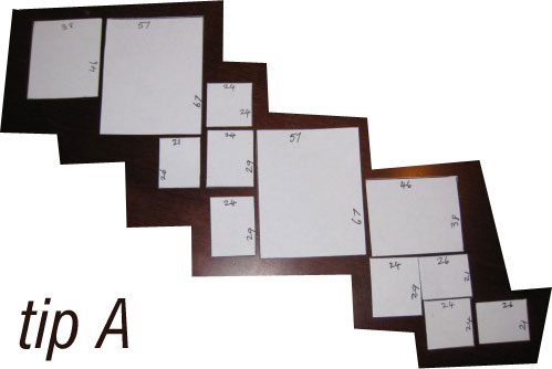 Najvažnije pravilo ovog načina ukrašavanja stepeništa je praćenje linije koraka tj stepeništa. Najlakše ćete napraviti pravilan raspored ramova uz pomoć papira isečenih na dimenzije ramova. Prvo napravite raspored ramova na podu pa krajne rešenje prenesite, ram po ram, na zid. Prikazujemo vam neke od naših predloga za slaganje 12 ramova na zid stepeništa. Brojevi na papirima označavaju dimenzije ramova u centimetrima.