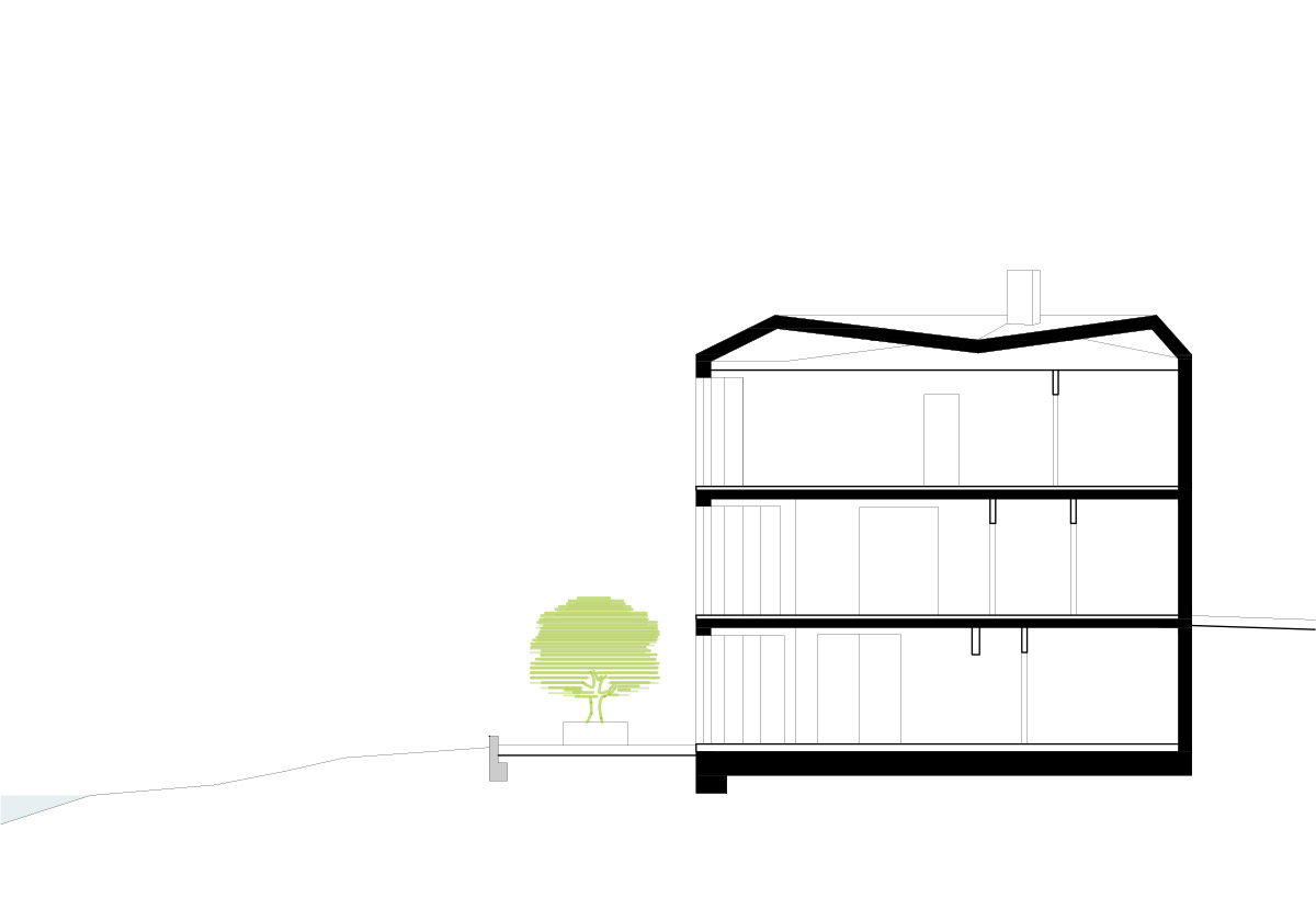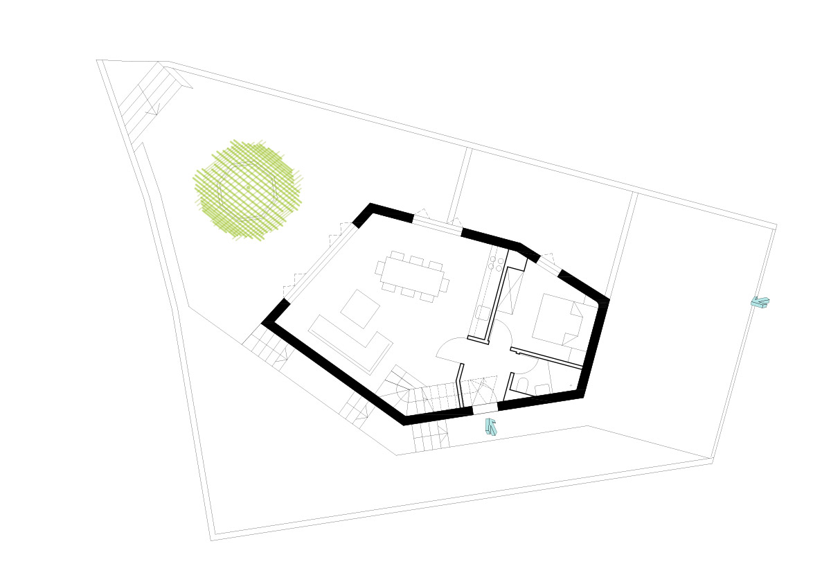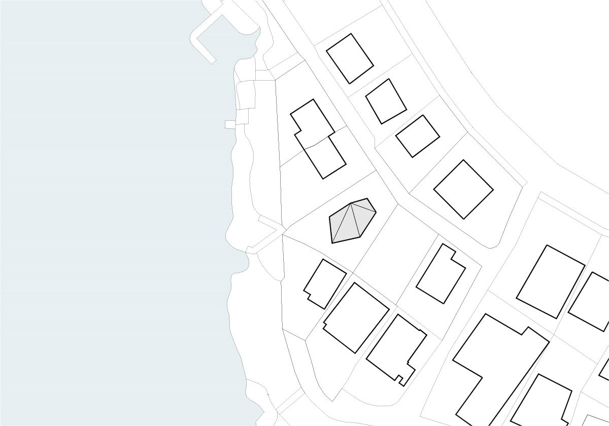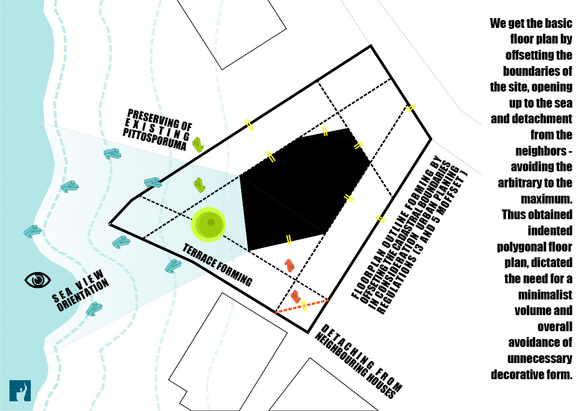 Mala površina parcele uslovila je da položaj novog objekta bude na minimalnim odstojanjima i paralelno s granicama parcele, kako bi se dobila maksimalna korisna površina. Oblik osnove uslovljen je i željom za otvaranjem pogleda prema moru, očuvanjem postojećeg stabla smokve, formiranjem terase u parteru i odvajanjem od najbližih komšija. Kako bi se zadovoljile potrebe korisnika, prostorije se smeštaju na tri etaže.