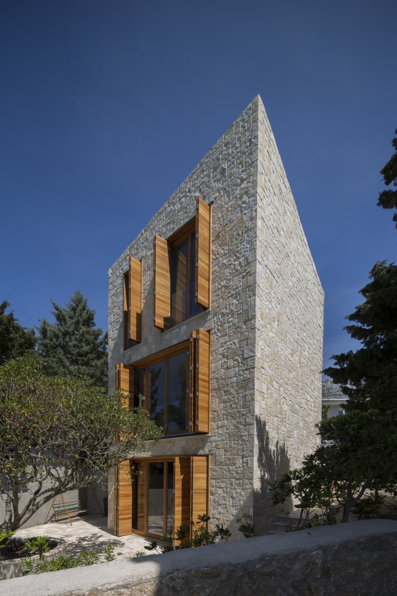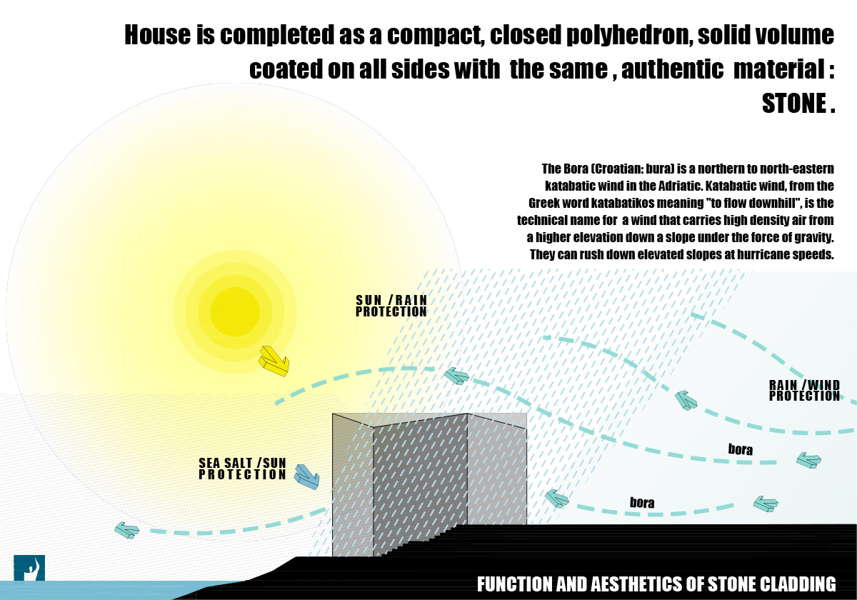 Tako dobijena poligonalna osnova svojom je složenošću nametala potrebu za minimalističkim volumenom i izbegavanju suvišne dekorativnosti ukupne forme. Položaj kuće blizu mora, i to na području poznatom po ekstremnim naletima bure, zahtevao je oblikovanje koje bi odgovaralo podneblju i specifičnostima lokacije – velika koncentracija soli, visoke temperature leti, jaki udari vetra. Kuća se realizuje kao kompaktni, zatvoreni poliedar, čvrsti volumen obložen sa svih strana jednakim materijalom – kamenom, kao autentičnim materijalom najpogodnijim za održavanje. Krovne ravne su rešene kosinama radi lakšeg odvođenja vode i obložene su takođe kamenom.