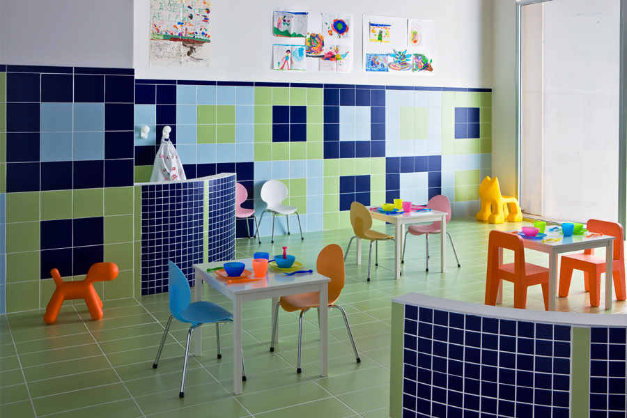 Pogledajte kako je izveden fasadni zid biblioteke Luigi Lombardi, Bari (Italija) kao i kupatila, izložbeni salon i dečiji vrtić u pločicama jarkih boja.