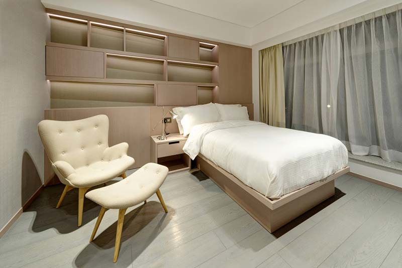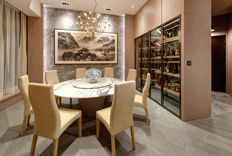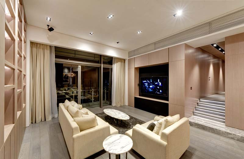 Tako je kineski studio In Hims iskoristio drvo i mermer kao obloge na zidovima dok je celokupni tapacirani nameštaj u bež tonovima. Crni detalji, kao što je niša za TV ili niše u plafonu, u koje su smeštene svetiljke, ističu se u ovom svetlom prostoru.