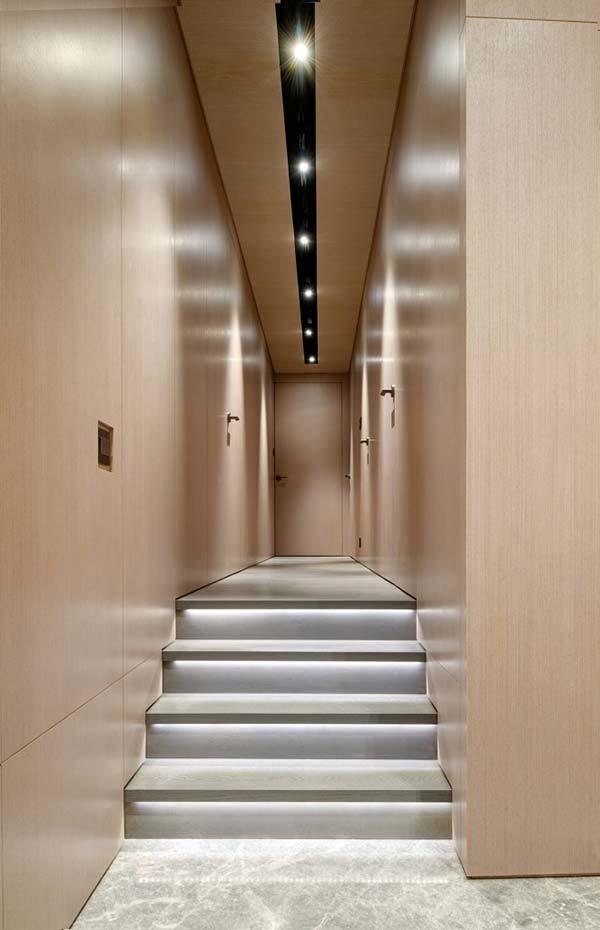 Veliku pažnju arhitekte su posvetile rasveti i osvetljenju. Tako je u veliki broj zidnih niša izvedenih u drvenoj oblozi ugrađeno svetlo dok su LED trake postavljene ispod gazišta stepenika.