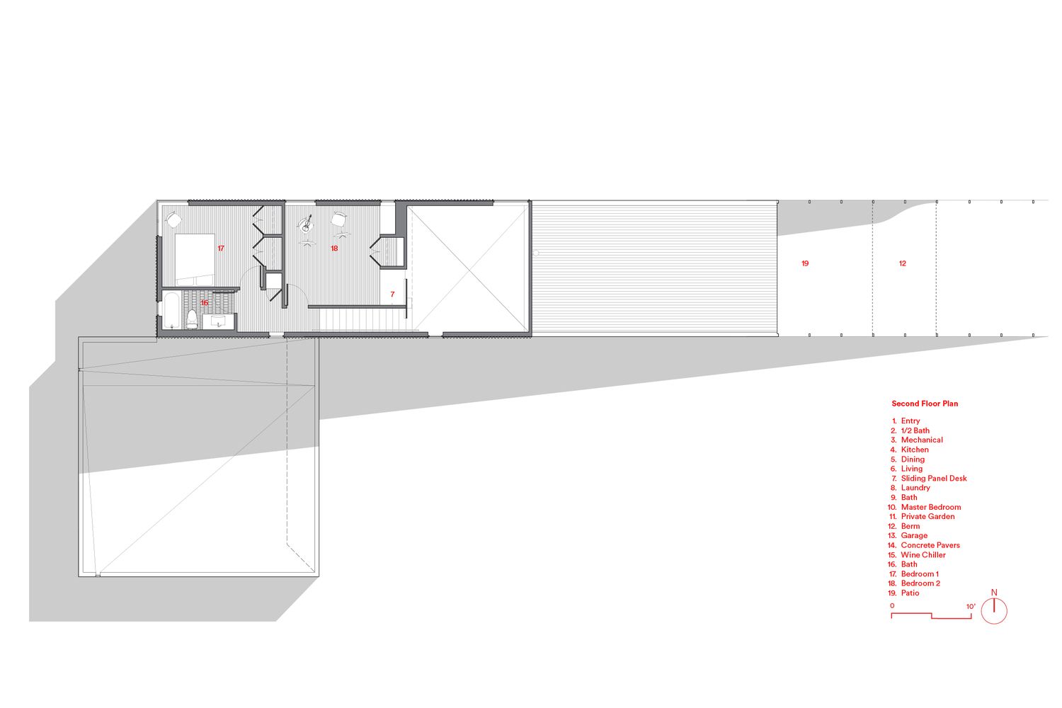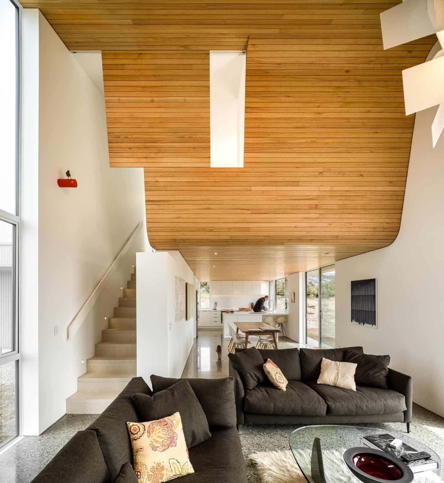 Nasuprot tamnom eksterijeru, enterijer kuće je izveden većinski u svetlim materijalima. Delovi podova, zidova i plafona su izvedeni od obloga napravljenih po narudžbini, od mlevenog eukaliptusa, koji se uzgaja lokalno. Ostatak zidova ostavljen je u čistoj, beloj boji kako bi najadekvatnije nosili kolekciju umetničkih dela klijenta.