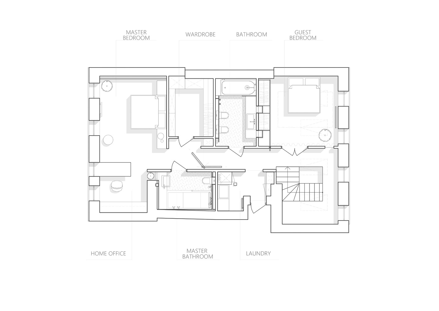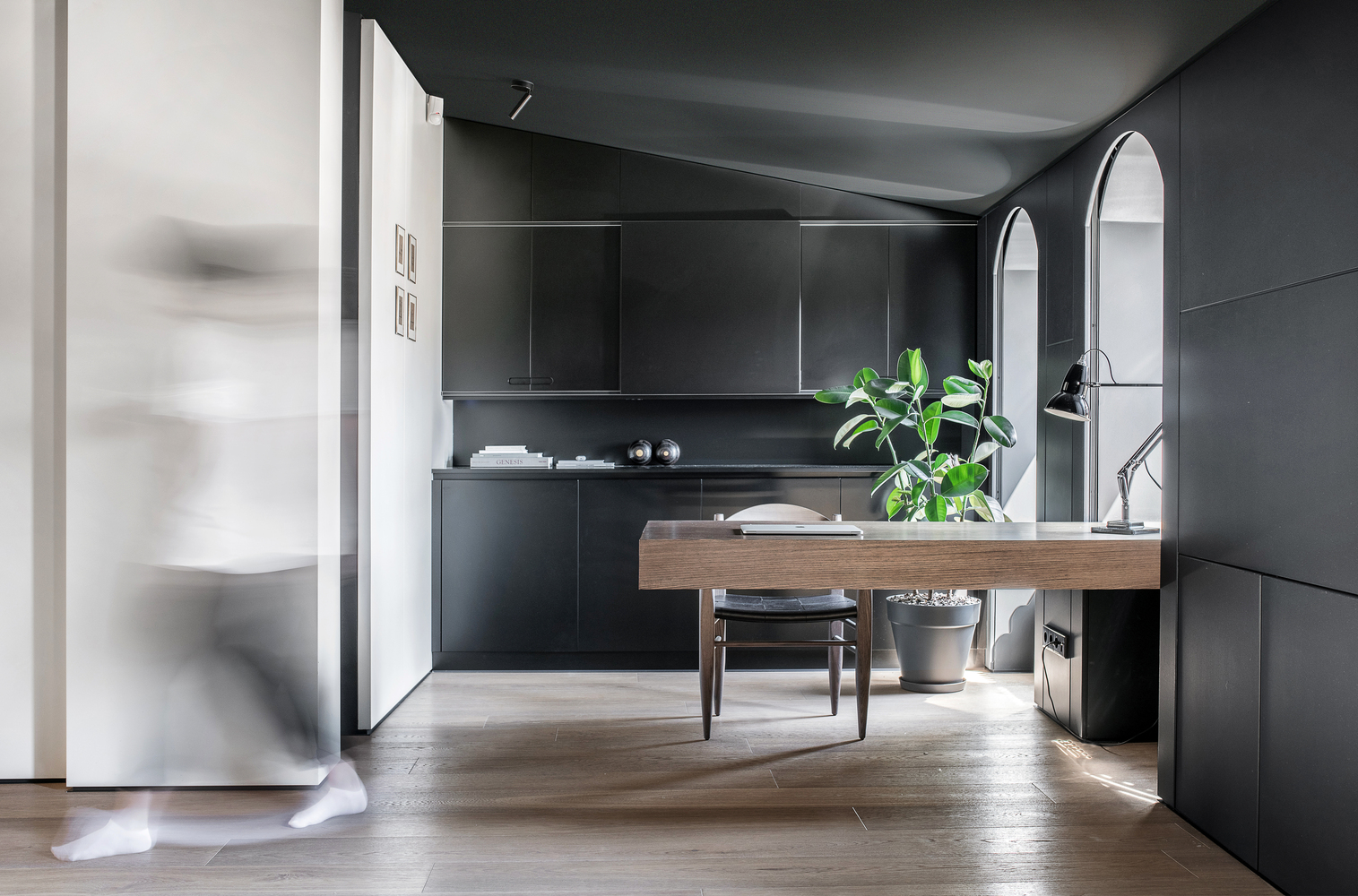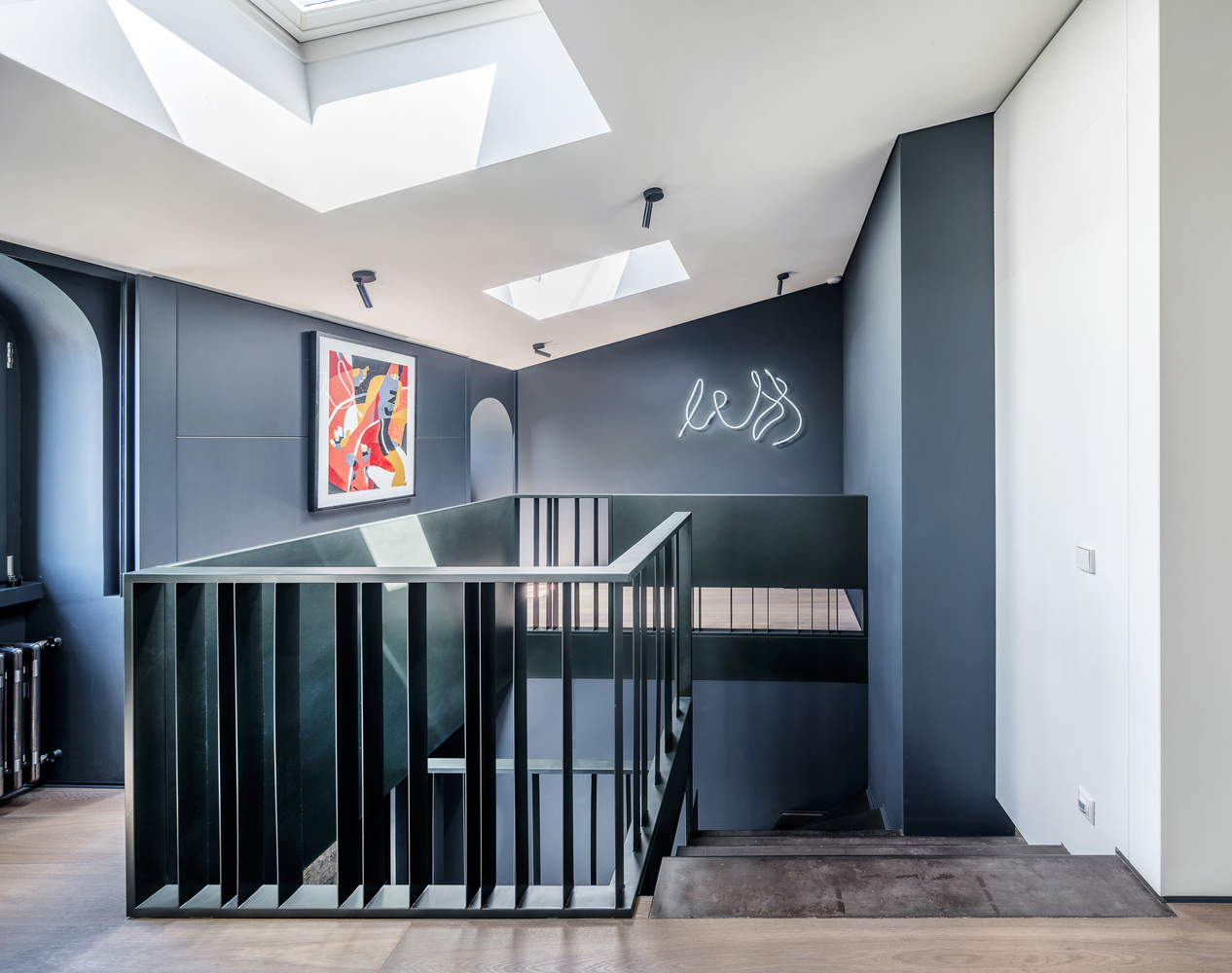 Drugi nivo je oblikovan bez primene istorijskih karakteristika nekadašnjeg prostora, ali monohromatska paleta čini da se on prirodno nastavlja na prizemlje stana.