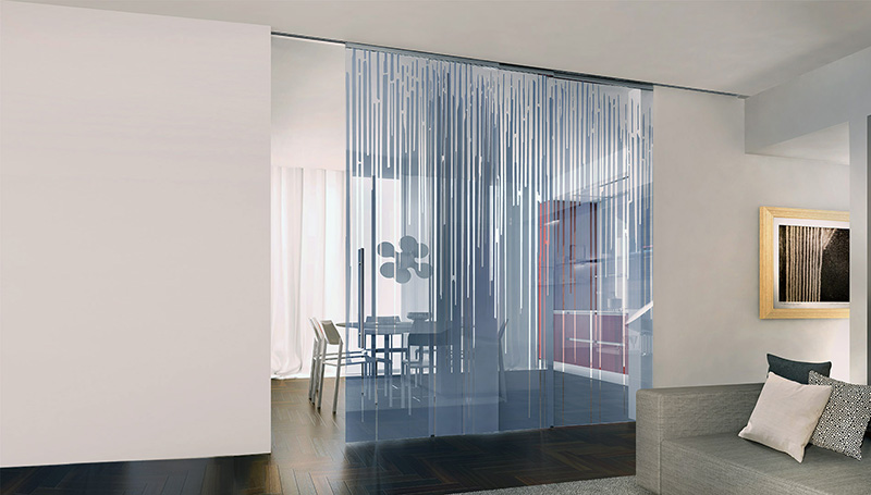 Staklena vrata mogu da se izvedu bez rama što dopušta da se štampani dekor dođe do izražaja u punom sjaju. Kližači se postavljaju na zid ili plafon. Izbegavaju se klizači odnosno šine na podu jer stvaraju prepreku prilikom hoda.