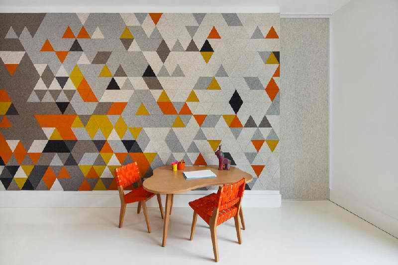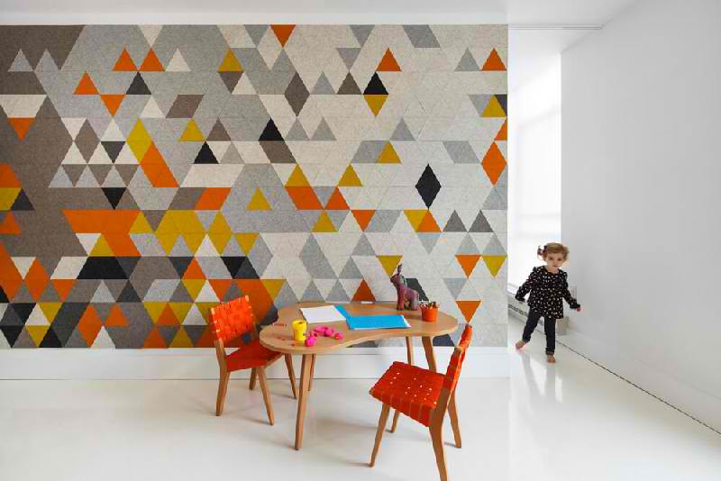 Fokalna tačka u enterijeru je zid napravljen od šarenih trouglova koji deli dečiju sobu od dnevnog boravka.