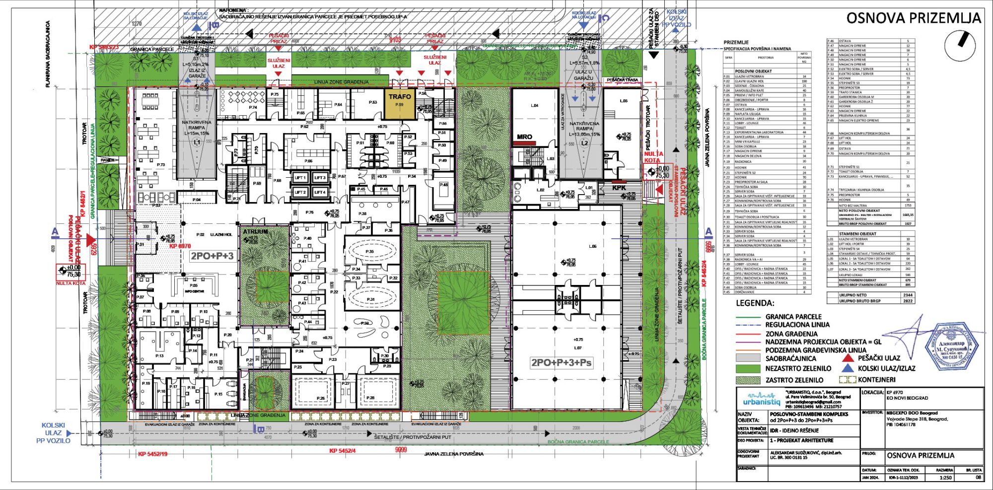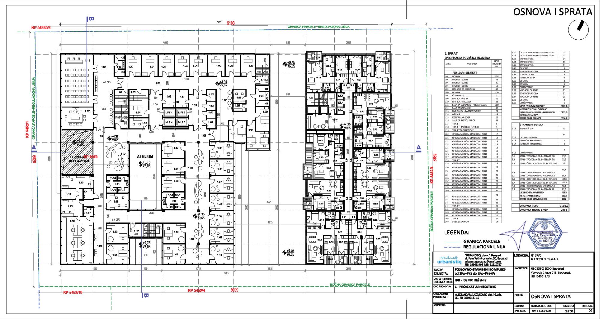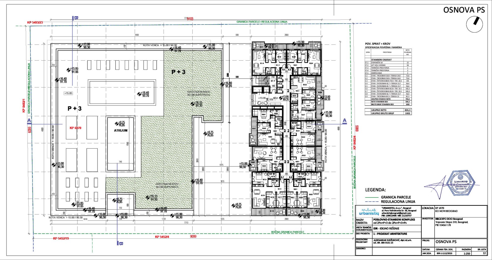 Deo objekta namenjen za stanovanje je projektovan sa prizemljem, 3 sprata i četvrtim, povučenim spratom.