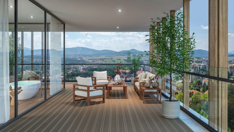 Svaki apartman poseduje terasu i neometani pogled, kupatilo sa tušem ili mini đakuzijem za dvoje, te parking mesto u podzemnoj garaži.