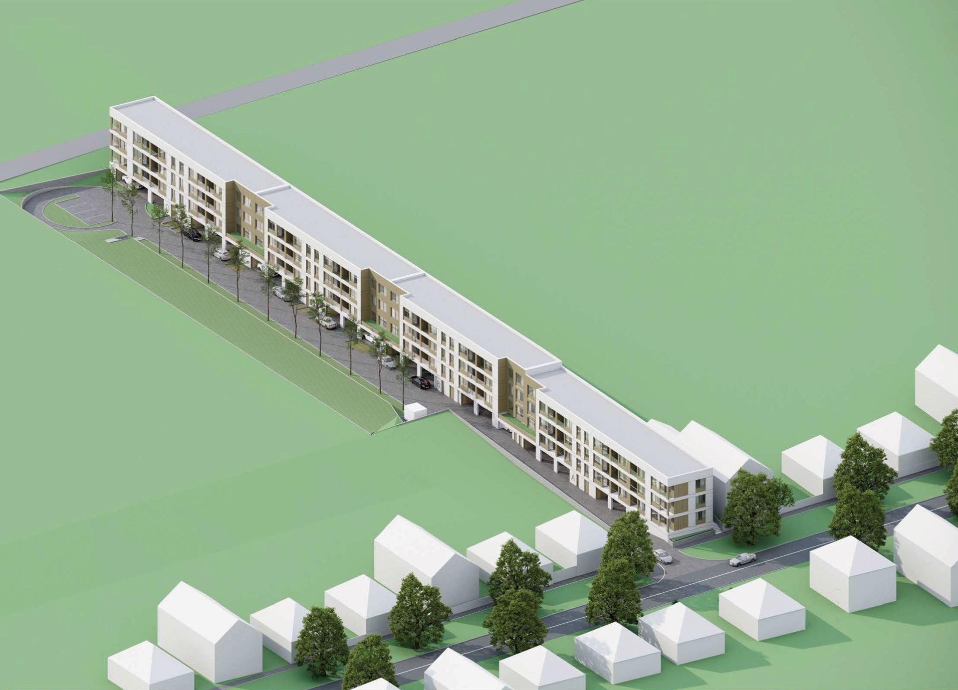 Urbanistički projekat na javnom uvidu otkriva stambeni kompleks sa četiri dvospratne lamele raspoređene linearno duž parcele.