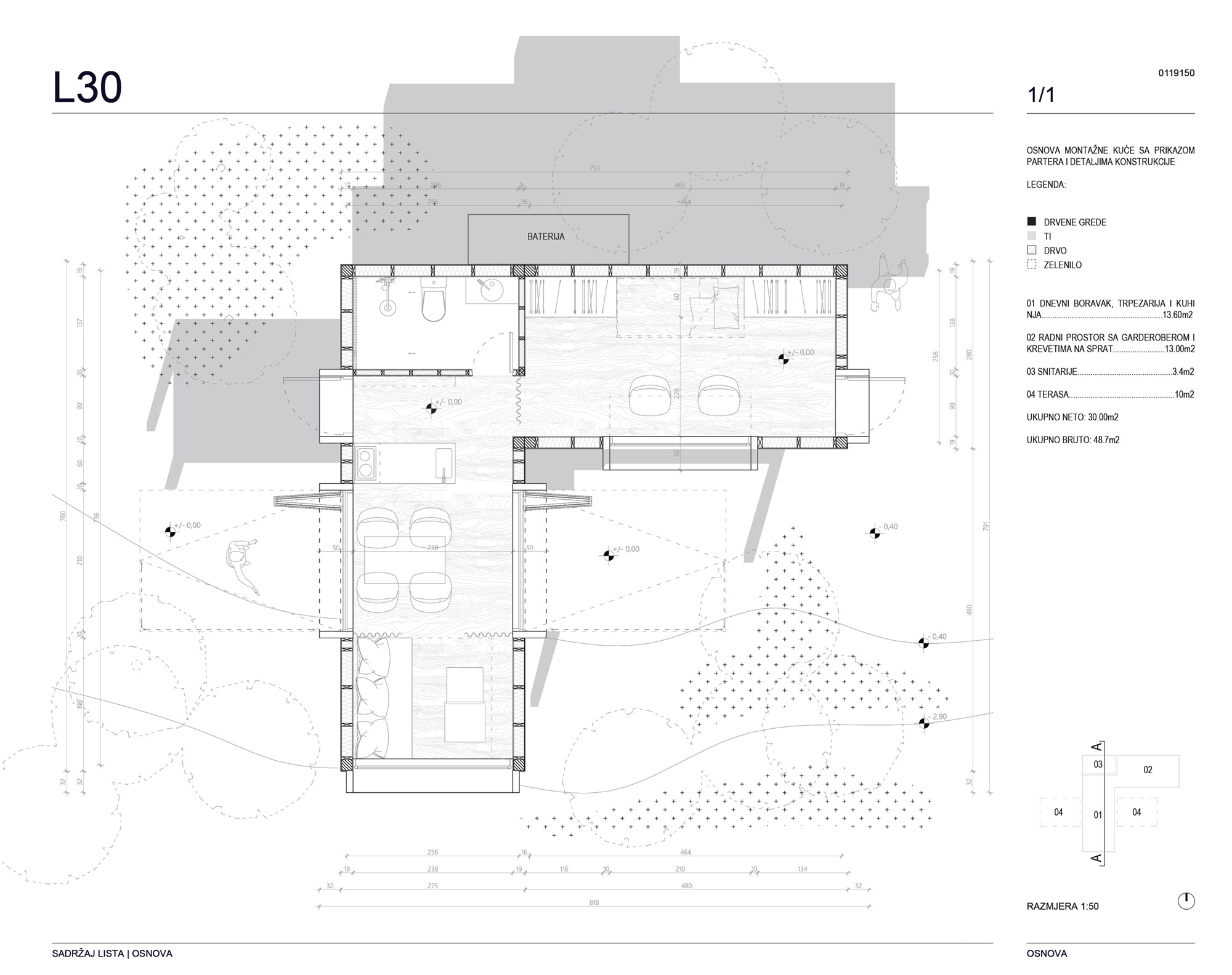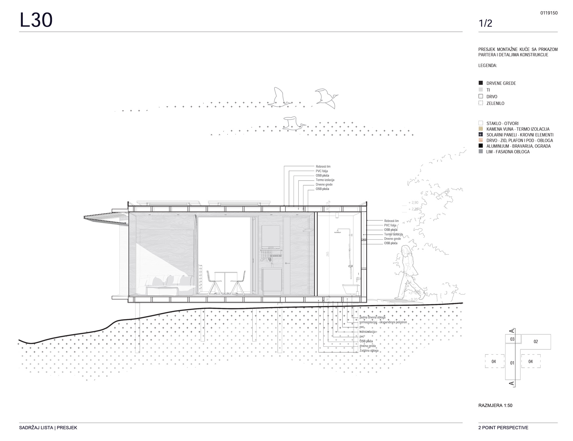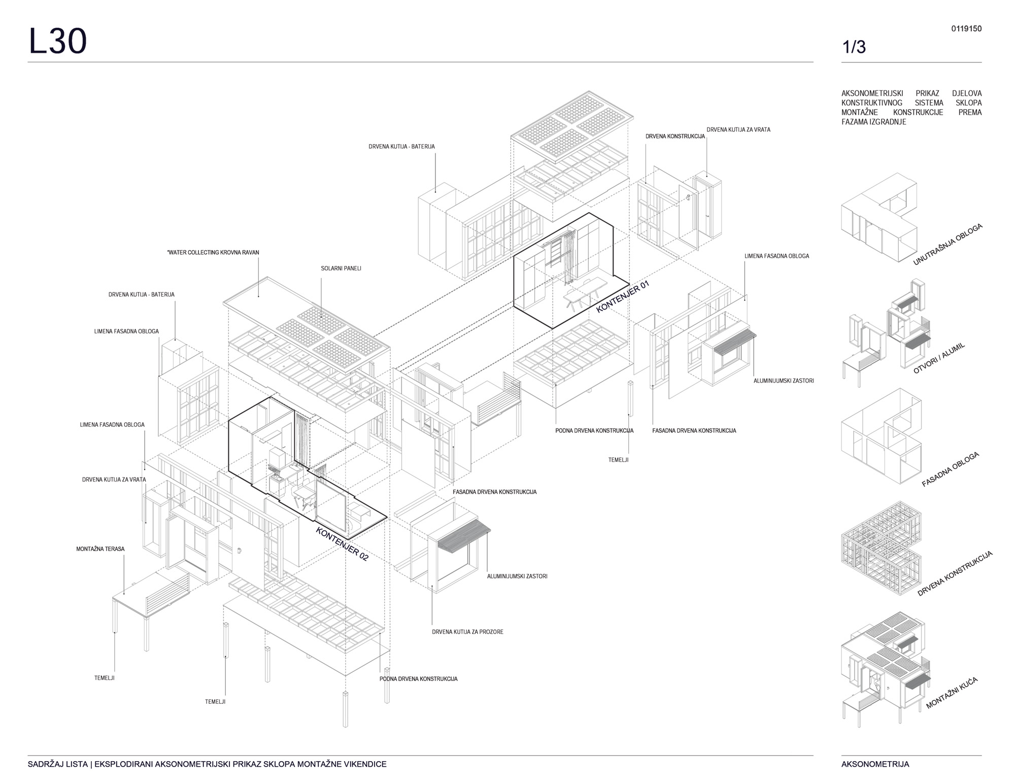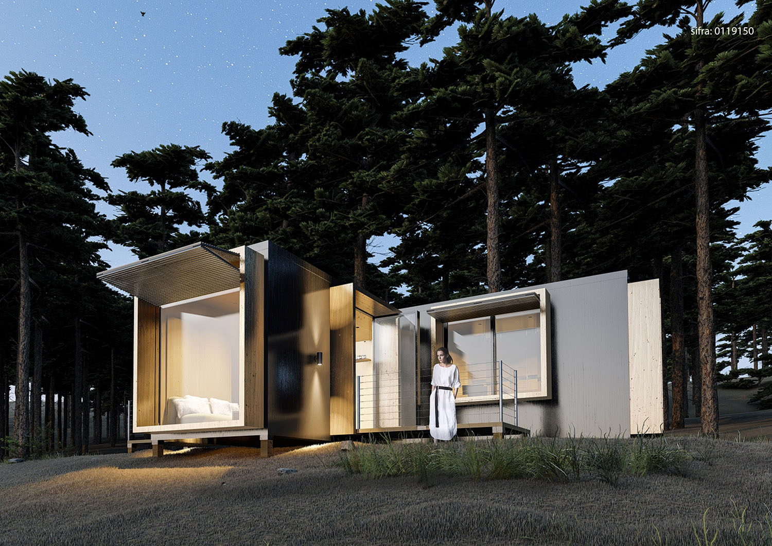 Smešten blizu obale mora na stenovitom terenu u Crnoj Gori, kuća predstavlja životni prostor koji je montažan, lagan za transport i od kompaktnih elemenata koji grade otvorenu strukturu. Sama oblikovnost kuće je inspirisana brodskim kontejnerima, dok je prostor projektovan kao višenamenski. Mogućnost zatvaranja objekta, jednostavnost izrade i montaže stavljaju ovaj objekat u red retkih koji celovito zadovoljavaju kriterijume konkursa. „L“ organizaciona postavka otvara mogućnost formiranja intimnog dvorišta. Lako prilagodljiva potrebama porodice i mogućnosti dogradnje i promenljivosti. Način formiranja prostora nije zavistan od forme i ideja ima potencijal da se razvije kao projekat i u različitim dimenzijama, oblicima, budžetima.