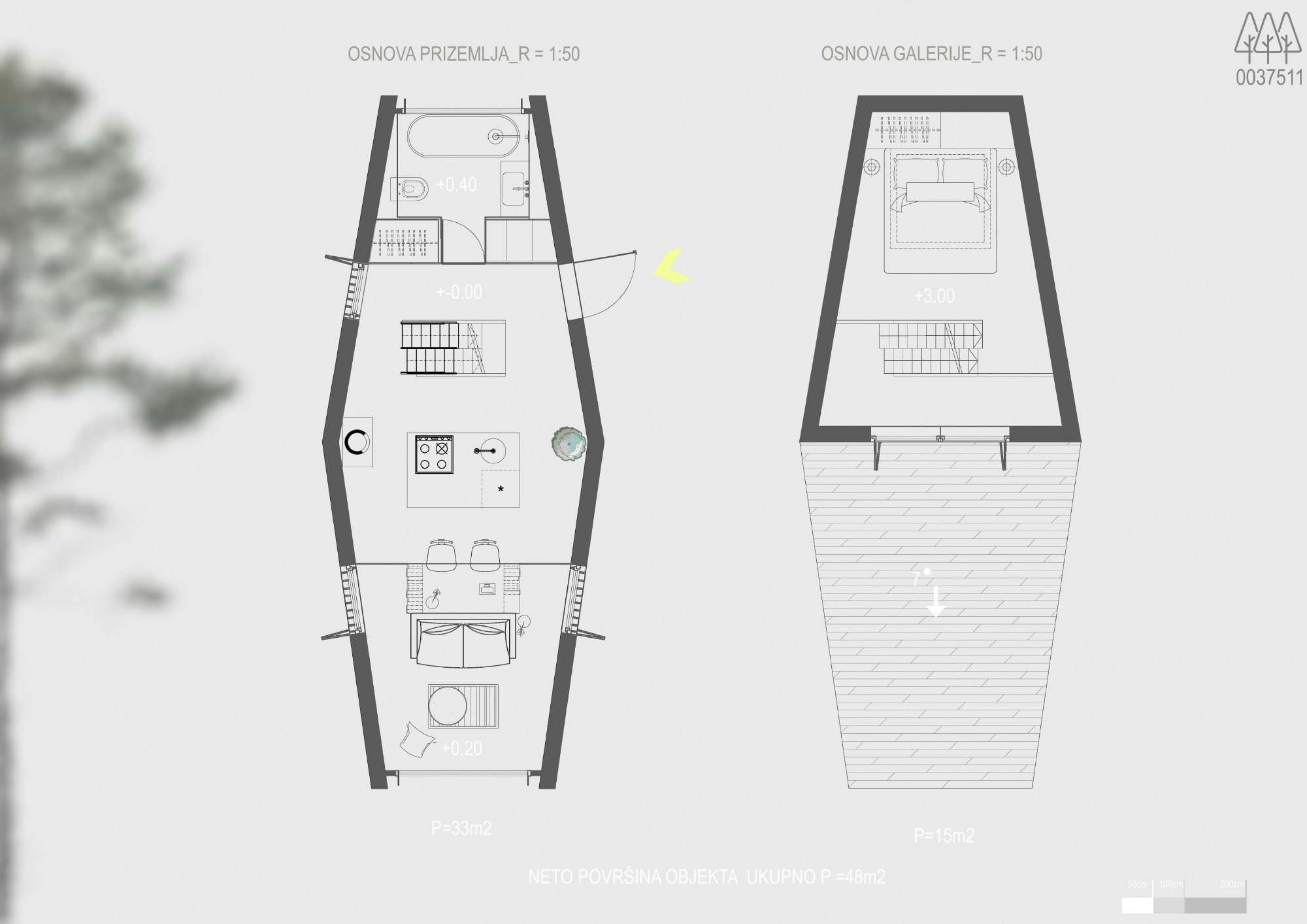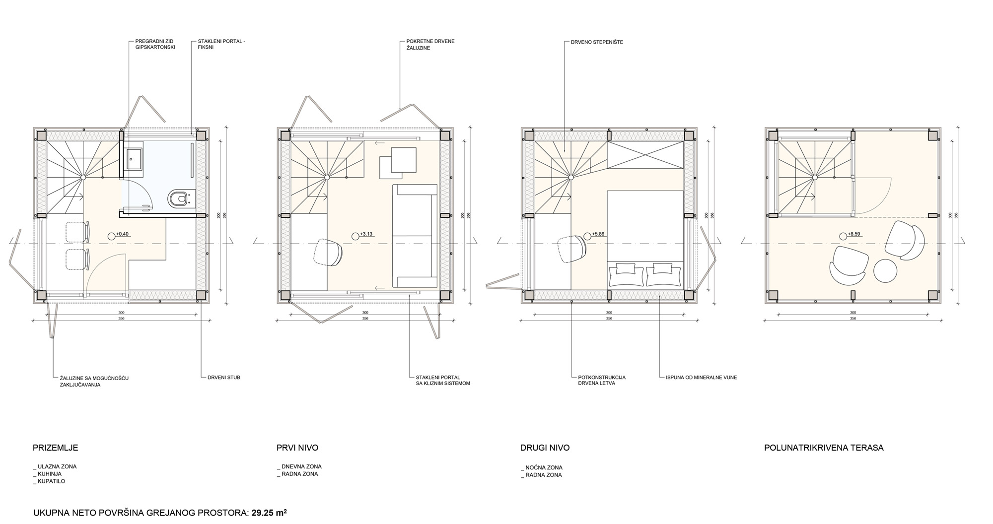 Sa druge strane, potrebno je preispitati formalni pristup koji je otežao funkcionalno rešenje. Dvostrano “zasecanje” osnovnog oblika po dijagonali deluje efektno ali suvišno – jer pravi značajne poteškoće u organizaciji osnove. Pojednostavljena verzija ove kuće bi imala više potencijala i svakako pripada realnim i ekonomski, ali i ekološki poželjnim rešenjima. Odabir drvenih temelja je više nego upitna odluka – možda čak i neizvodljiva. Otvaranje unutrašnjosti ka prirodi i pristupnom platou najveće su prednosti ovog jednostavnog, ali elegantnog rešenja. Ova zamisao je možda najrealnija i najpristupačnija za razradu i izgradnju.