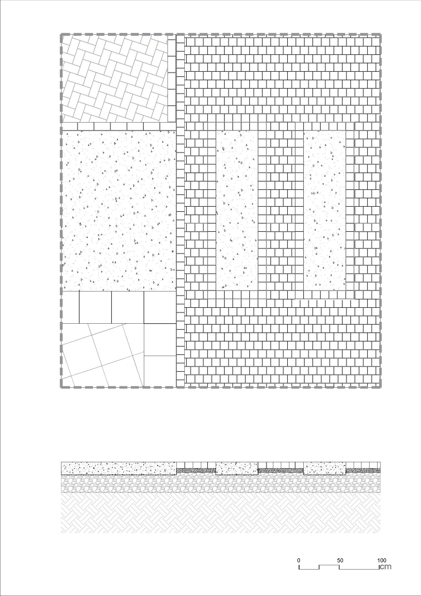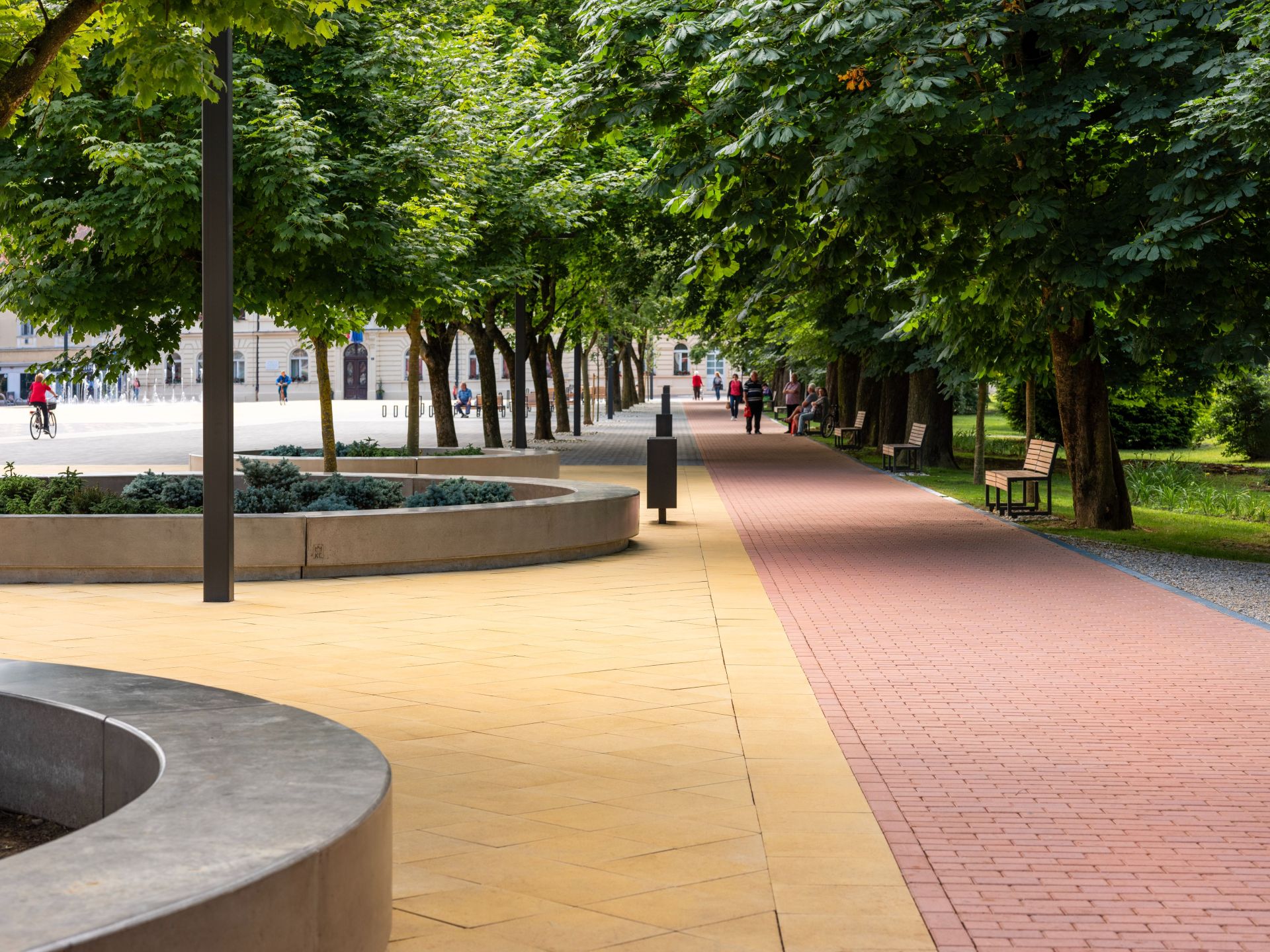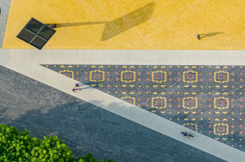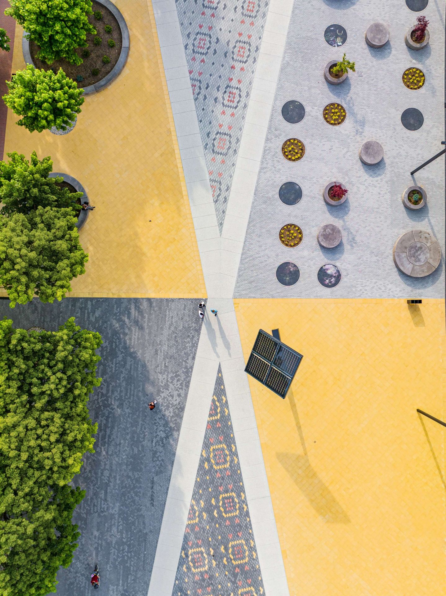 Multifunkcionalne zone za povremena okupljanja su oker-žute boje, dok su ostale zone u nijansama sive. U sredini se nalaze mozaici koji su interpretacija poznatog podravskog veza. Biciklistički „X“ koji preseca trg napravljen je od grubo štokovanog betona kako bi naglasio promenu materijala.