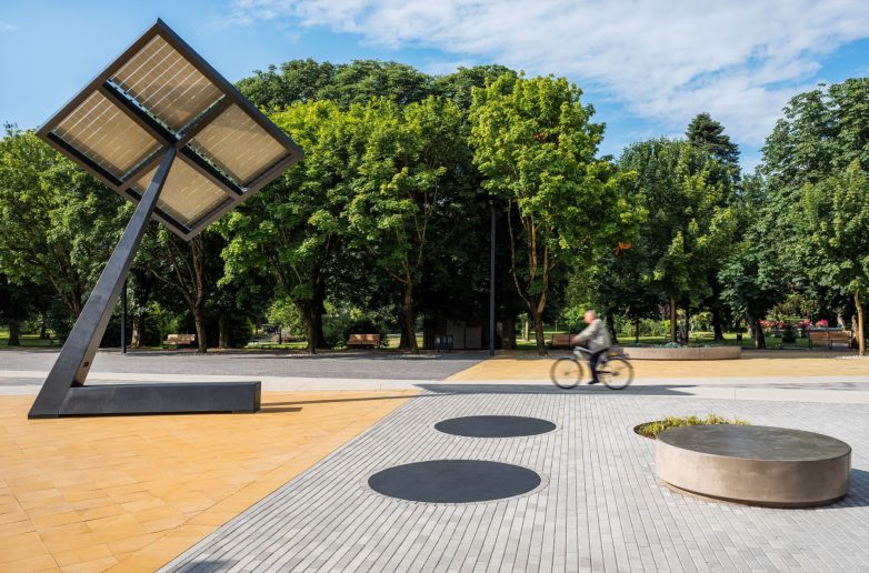 U zoni ispred biblioteke i bioskopa dominira solarno stablo opremljeno wi-fijem, priključcima za struju, te ekranom na kojem se prikazuju meteorološki podaci. Unutar obuhvata postavljene su i skulpture poput postojećeg, ali i novog spomenika biciklistima.
