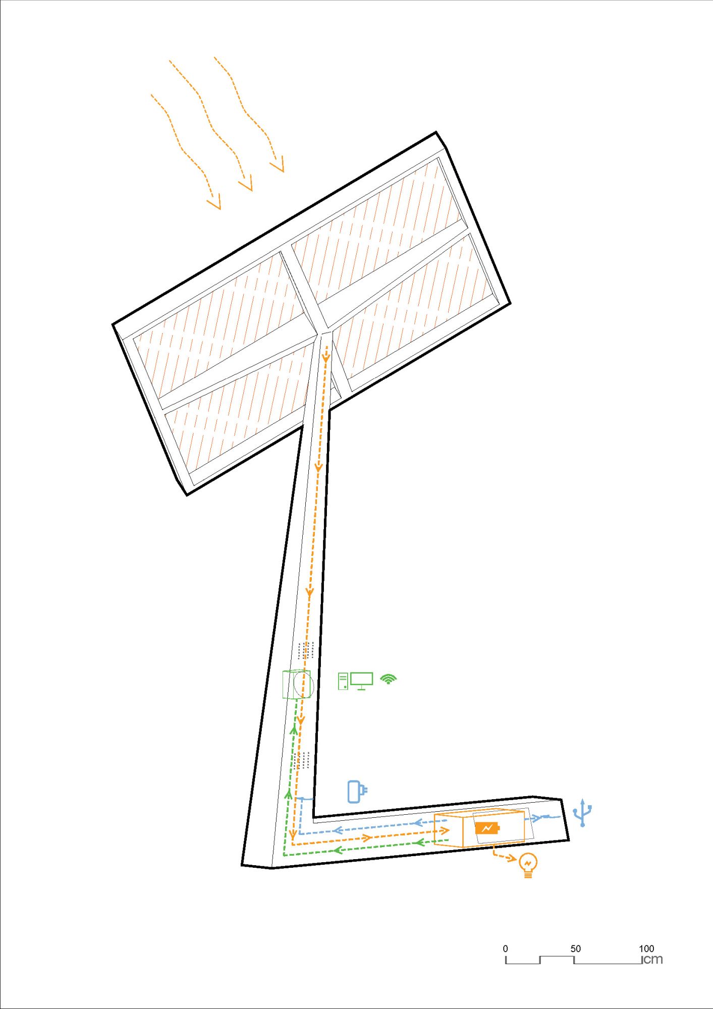Solarno stablo opremljeno je wi-fijem, priključcima za struju, te ekranom na kojem se prikazuju meteorološki podaci.