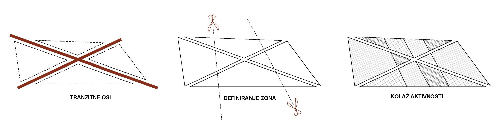 „Definisana zona je poput kolaža aktivnosti, nastala s obzirom na mikrolokacijske specifičnosti i dosadašnje navike građana. Na Zrinski trg u celosti je položena ’tapiserija’ manjih trgova strukturirana oko čvrstih osa biciklističkih staza u formi slova X. Svaka zona direktno korespondira s namenom okolnog konteksta ili donosi svoju novu namenu“, kažu iz studija i dodaju: