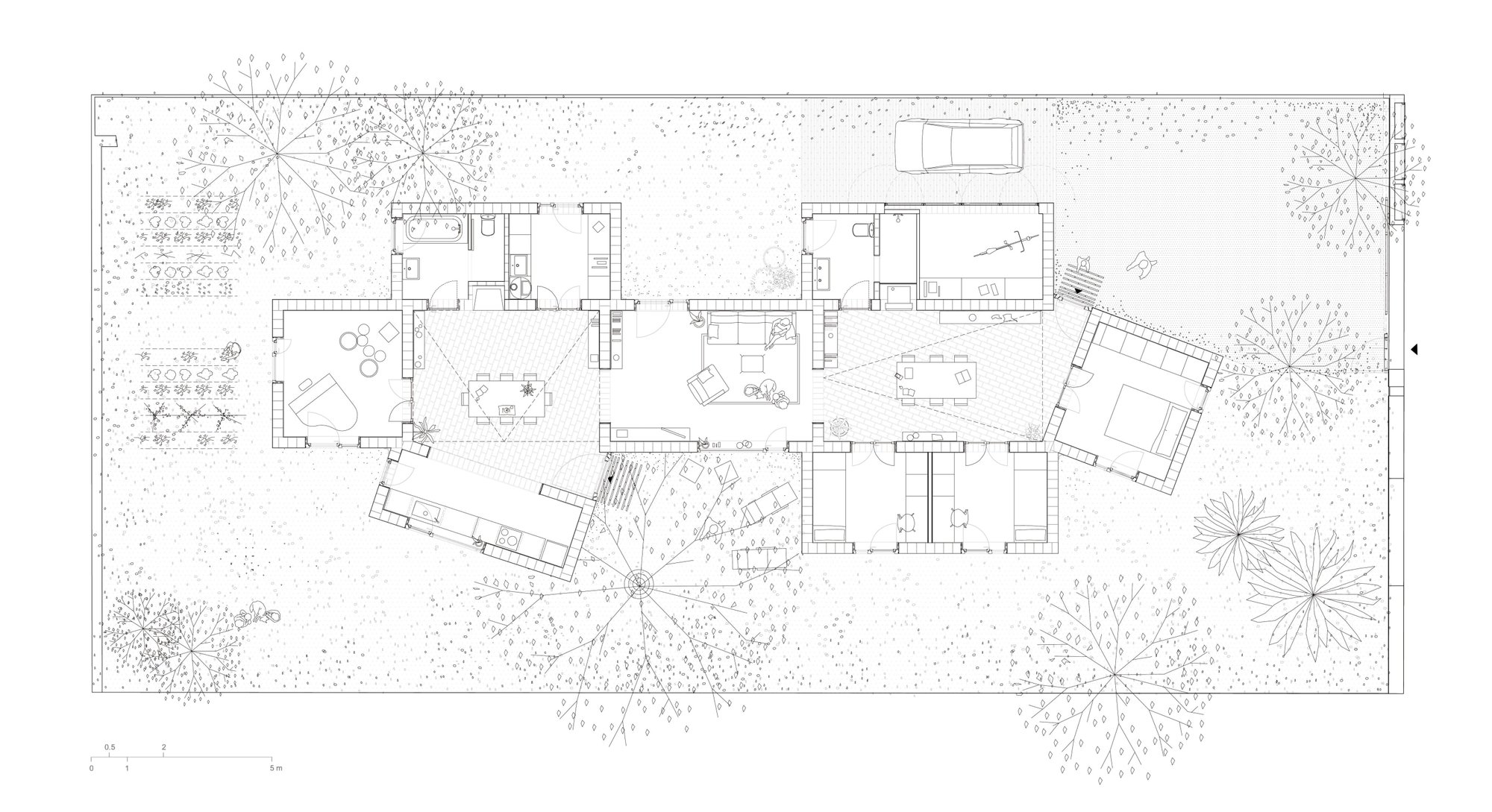 Polazna tačka bila je napraviti kuću sa dvorištem koji je njen sastavni deo. Dominantno drvo bibera kao i zimzelena komšijska stabla postavljena su tako da štite objekat od sunčevog zračenja, a nakon sprovedene studije solarnog uticaja, došlo se do zaključka da je najbolje usmeriti sunčevo zračenje preko zone krova. Tako je spavaći blok dobio velike zabatne prozore koji propuštaju prirodnu svetlost tokom zime, a omogućavaju unakrsnu ventilaciju tokom leta, pišu arhitekte za Divisare.