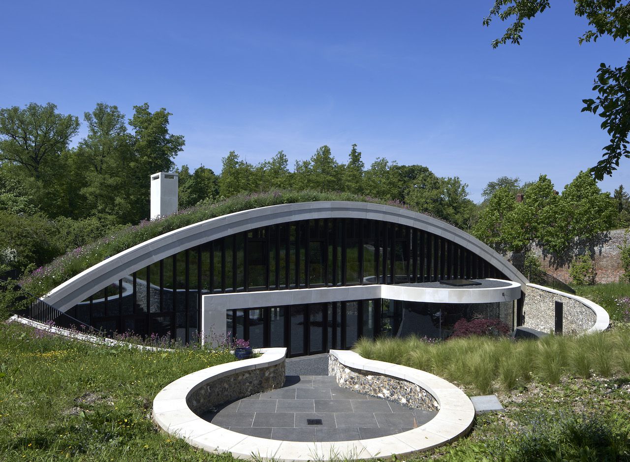 Dok su suteren i mezanin izvedeni od prefabrikovanog betona, prohodni krov je izgrađen od lameliranog drveta prekrivenog travom u završnom sloju.