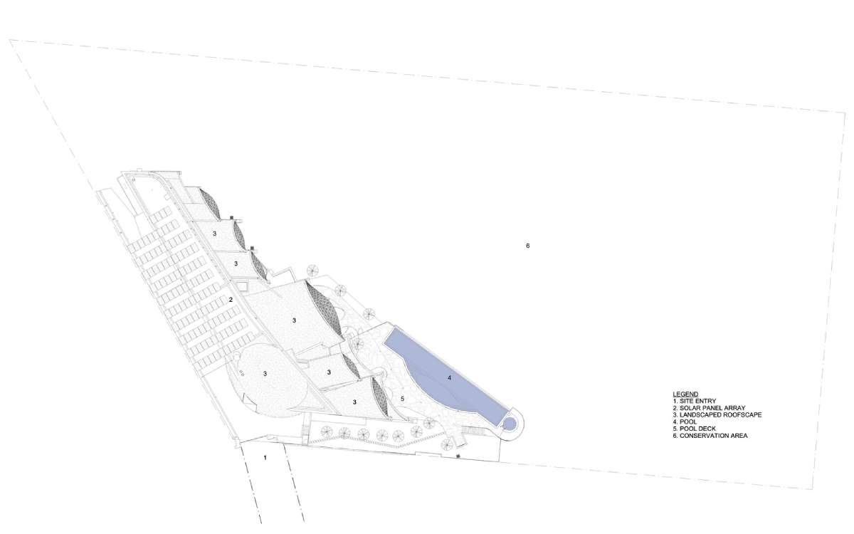 S obzirom na to da je ovaj masivni objekat znatnim delom ukopan u teren, stvorila se mogućnost da se obronci iznad objekta ponovo ozelene. Na ovaj način, gledano sa obale mora, kuća se kamuflira u okolni teren, što će vremenom biti još intenzivnije kada se vegetacija bude razvijala.