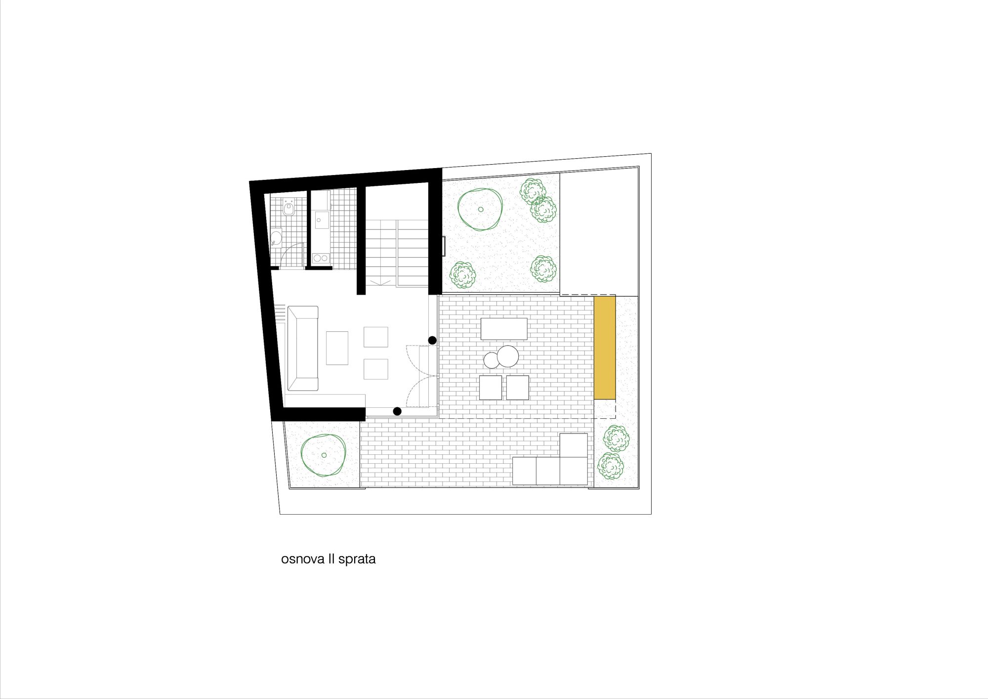 Kako bi klijentu omogućili veći komfor i ekskluzivnost stanovanja, objekat je obogaćen krovnom terasom rešenom u kaskadi ravnog krova, koja je prožeta zelenilom i upotpunjena pergolom od čeličnih kutijastih profila sa fiksnim brisolejima u dezenu drveta.