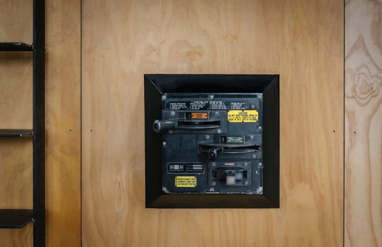 Na zidu na kom se nalaze i merdevine postavljena je kontrolna tabla, a tu je i mala dizalica koja prevozi teže predmete sa jednog na drugi nivo.