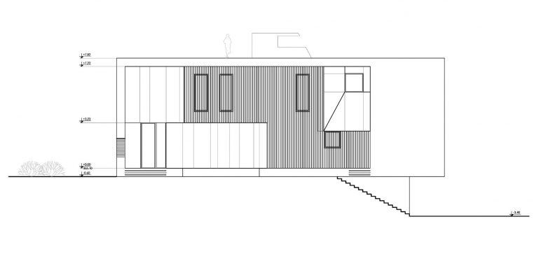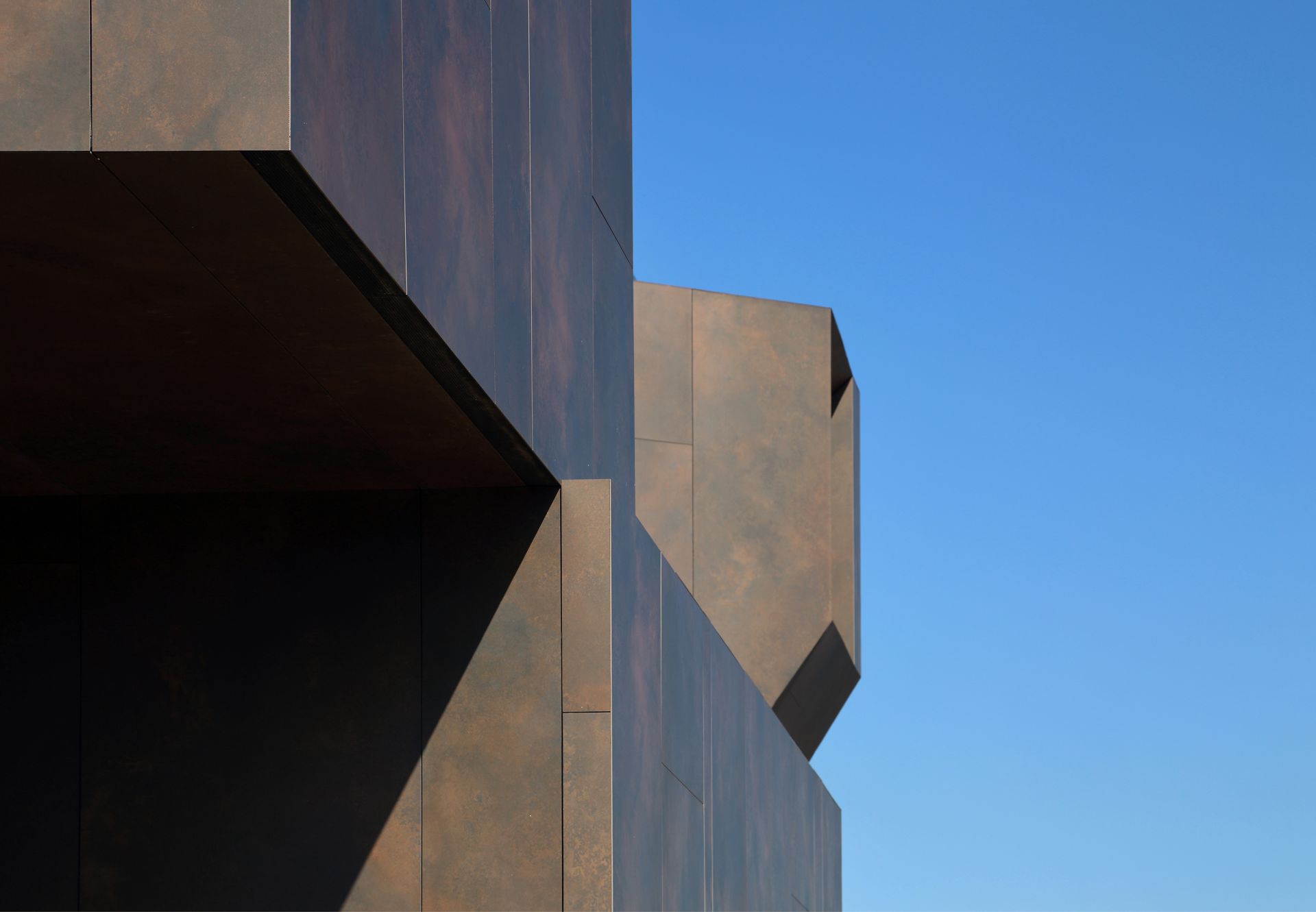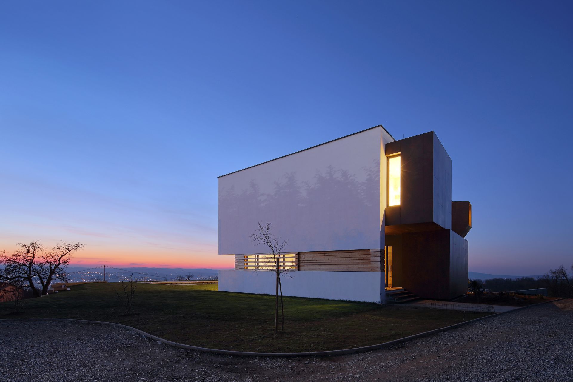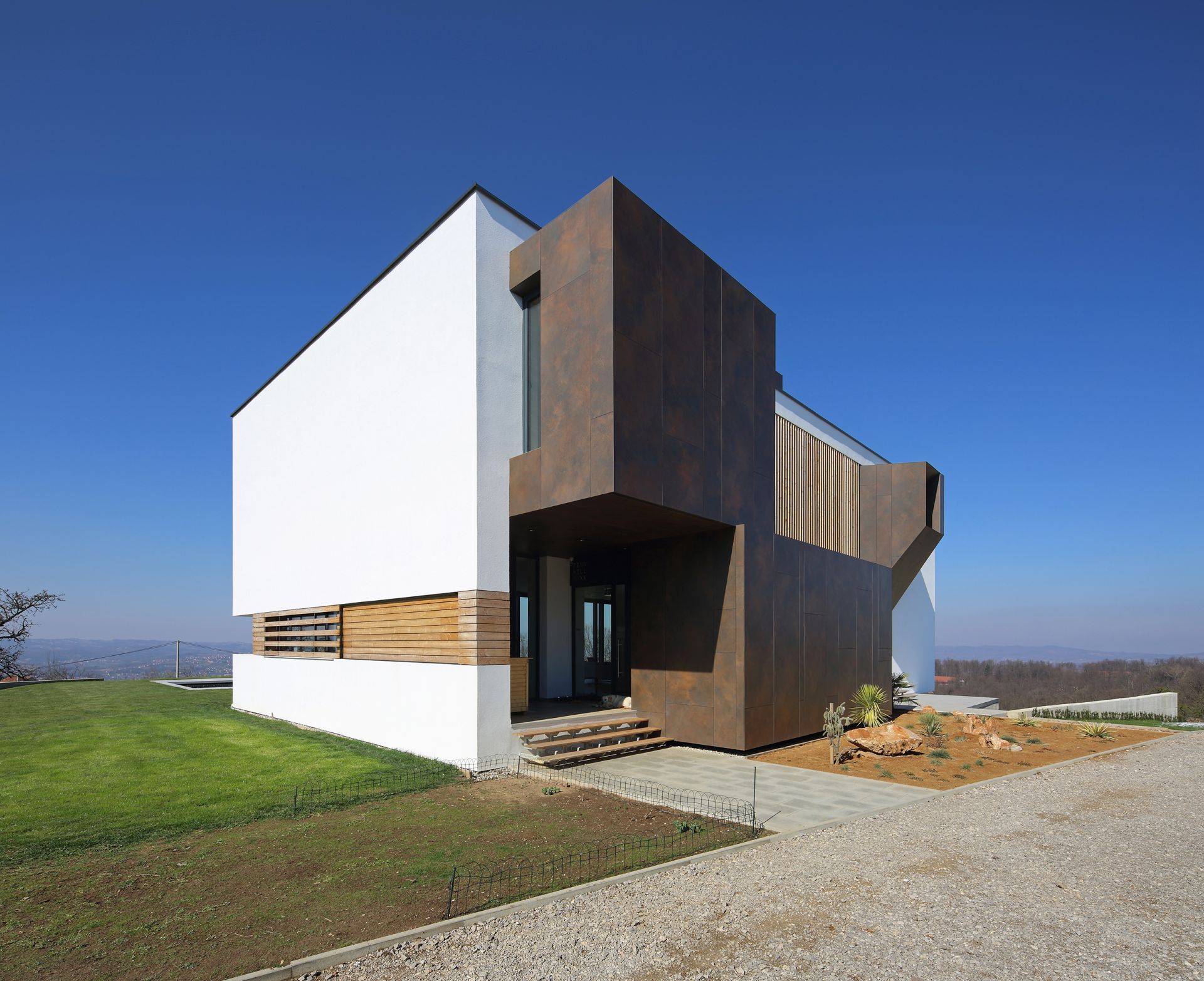 Materijalizacija istočne fasade, oblikovane poput savremene skulpture od keramičkih ploča sa teksturom kortena, kontrapunkt je osnovnom kubusu kuće i predstavlja ono nešto više u njenom oblikovanju, navode autori.