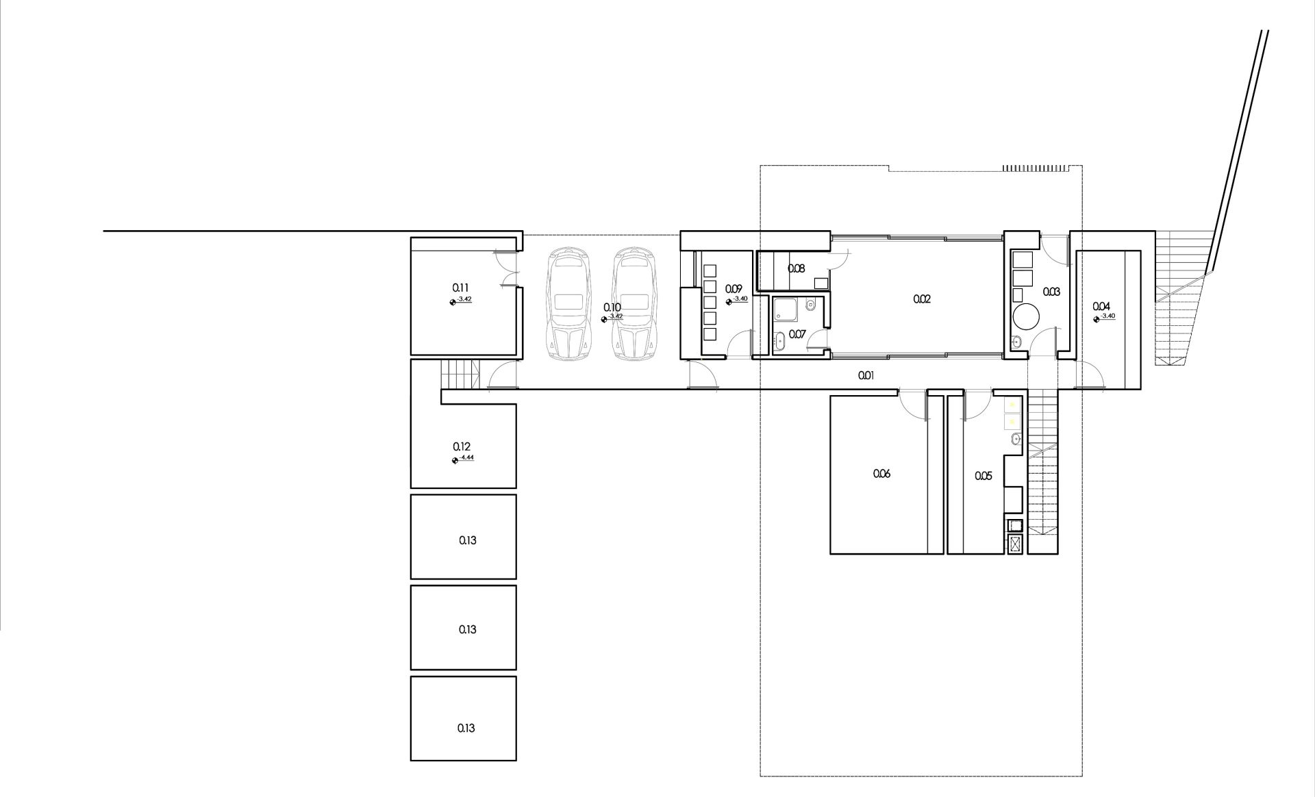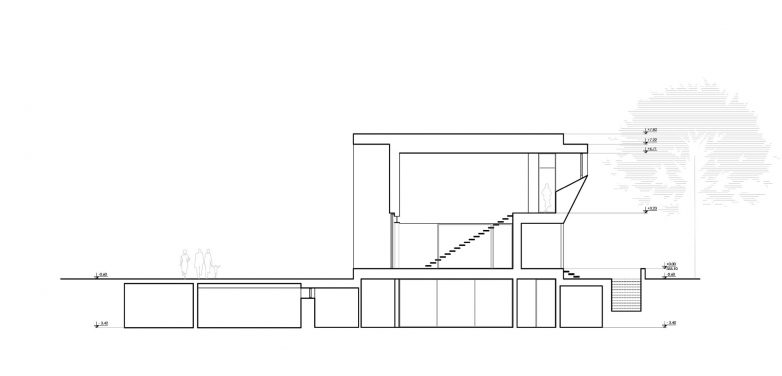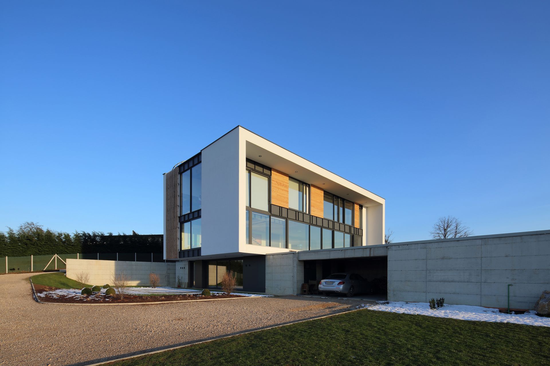 Koncept objekta sveden je na dve celine – pravilan beli kubus kuće koji dominira okruženjem i suterensku etažu koja je ugrađena u teren i nevidljiva prolaznicima.