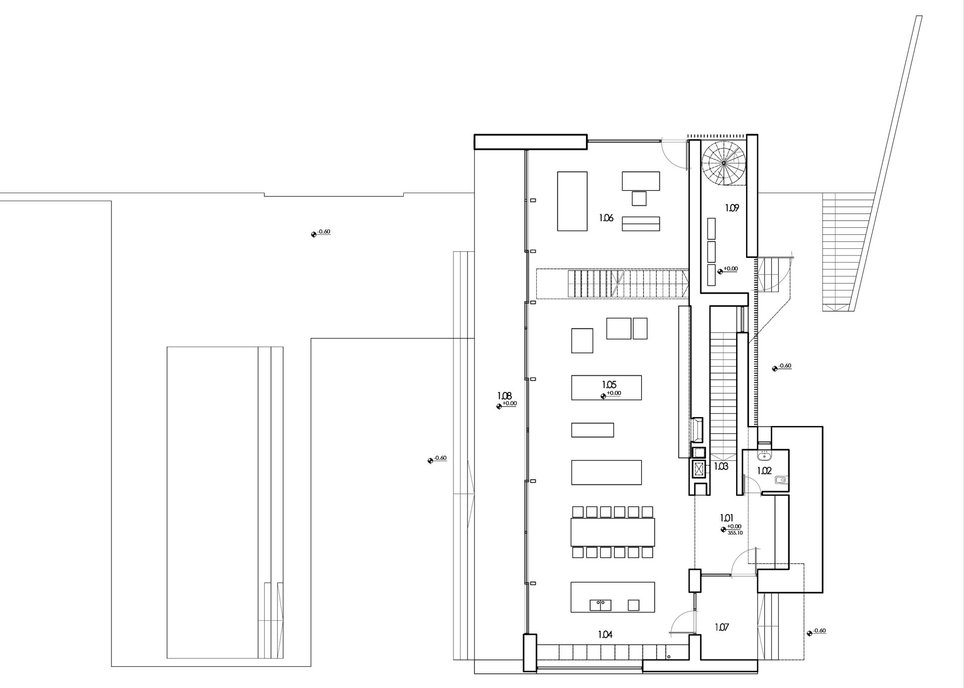 U otvorenom planu, dnevni boravak sa trpezarijom i kuhinjom, kao i radna soba, su na nivou prizemlja i zauzimaju površinu od oko 250 m2.