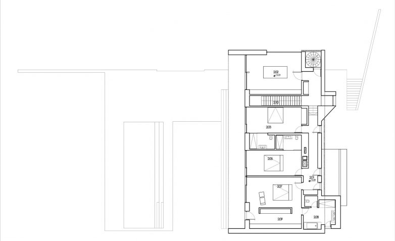 Iz dnevne zone kuće niz nekoliko stepenika silazi se na veliku popločanu terasu sa bazenom i mediteranski vrt. Kao i u prizemlju, sve prostorije na prvom spratu imaju orijentaciju prema gradu, a atelje dodatno i prema šumi.