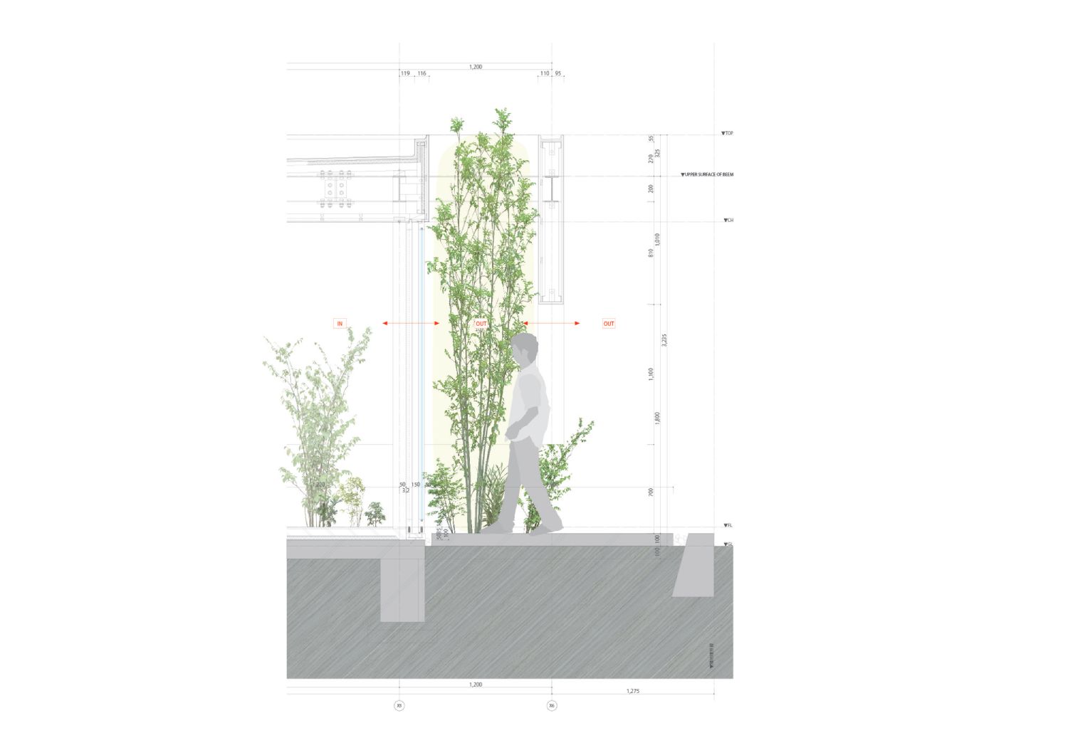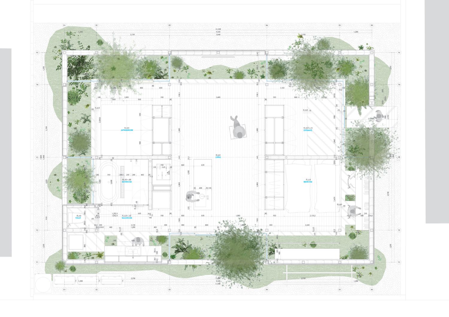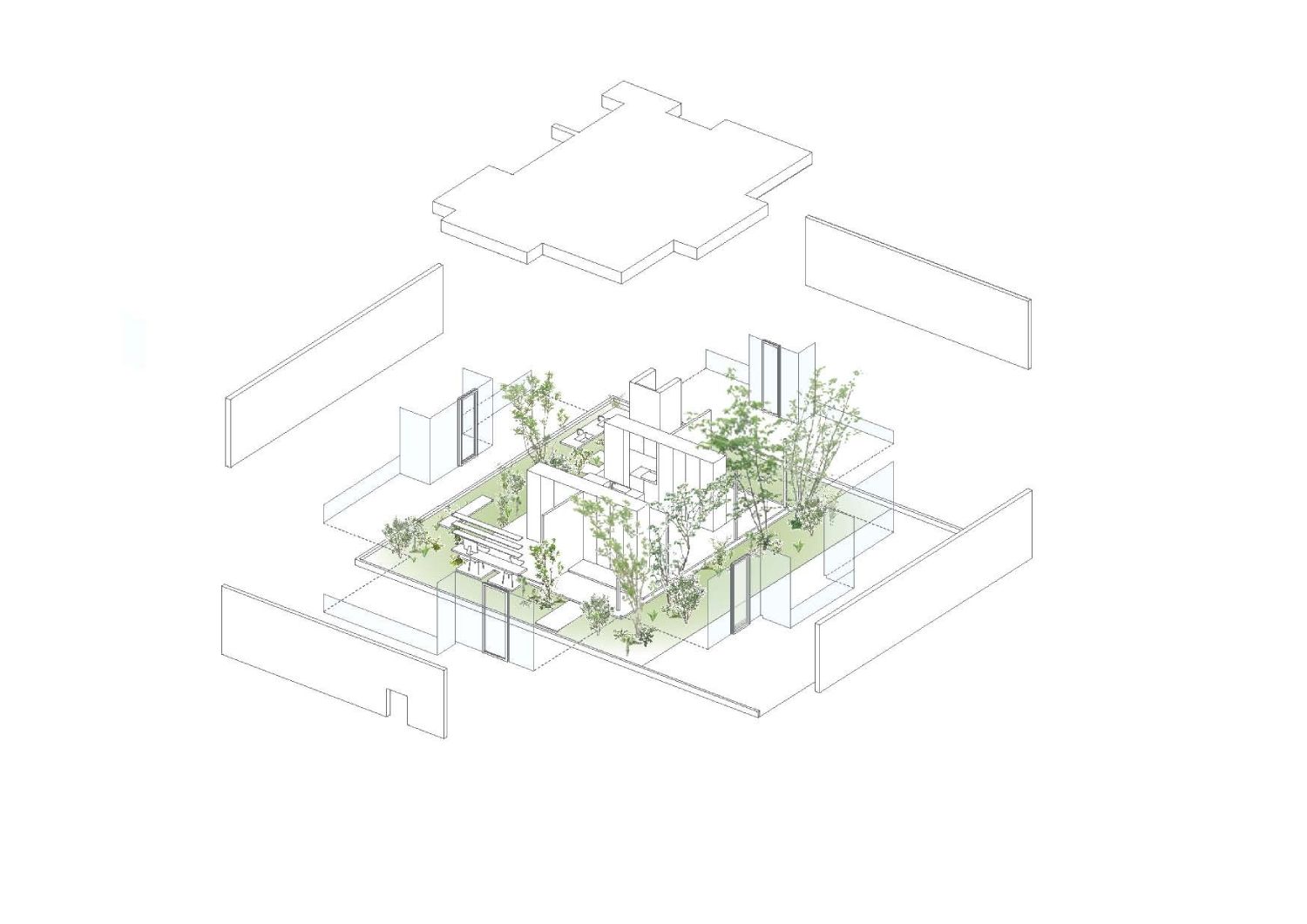 Prva zamisao bila je da se kreira unutrašnje dvorište. Međutim, na ovaj način nije obezbeđena potpuna privatnost, a pored toga prirodna svetlost i vazduh bi teško cirkulisali. Imajući ovo na umu arhitekte su se odlučile za obodno zatvoreno dvorište, ali sa spoljne strane kuće. Na ovaj način priroda intenzivno prodire u sve delove kuće, ali je ovo ima jedan problem – prodor svetlosti.