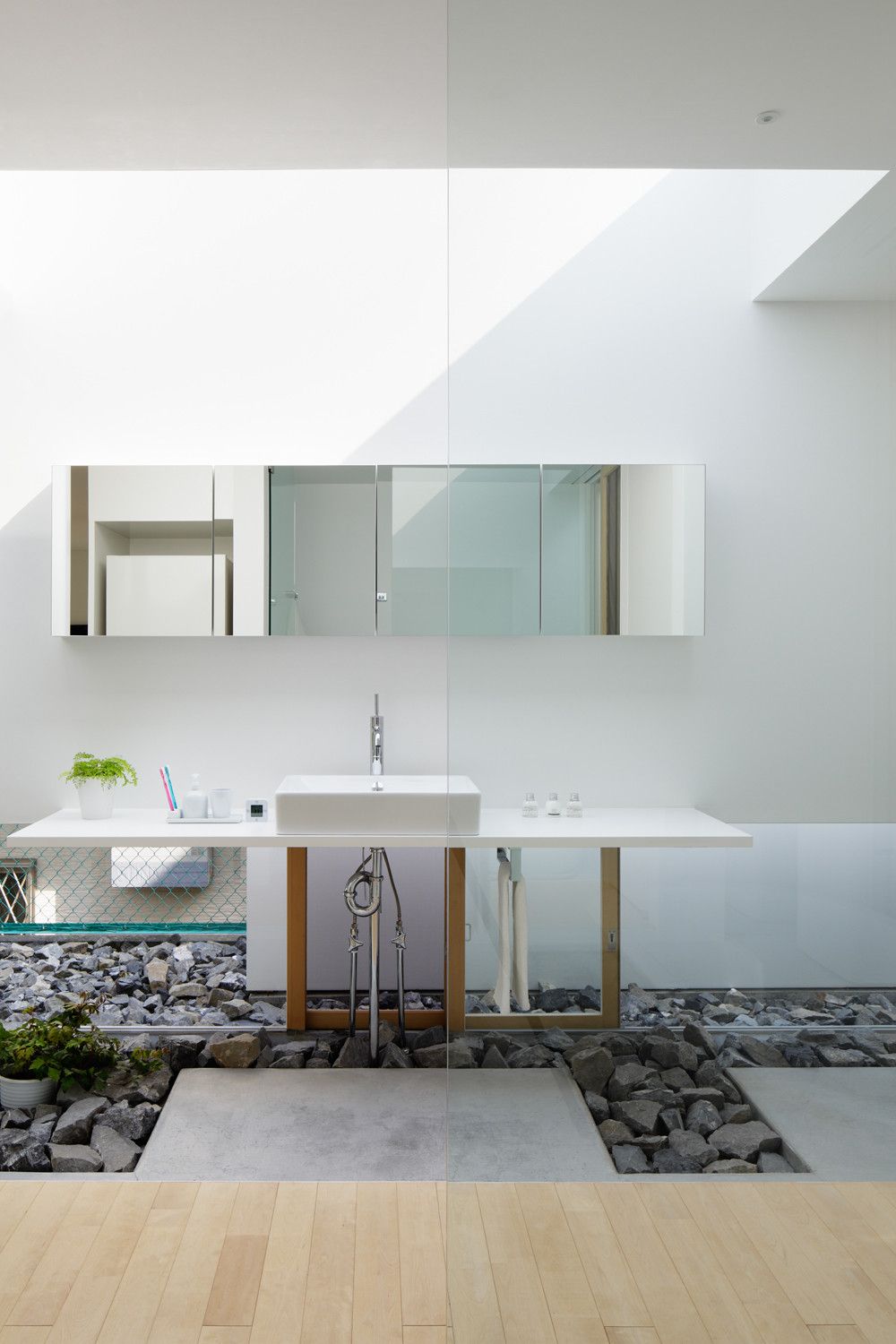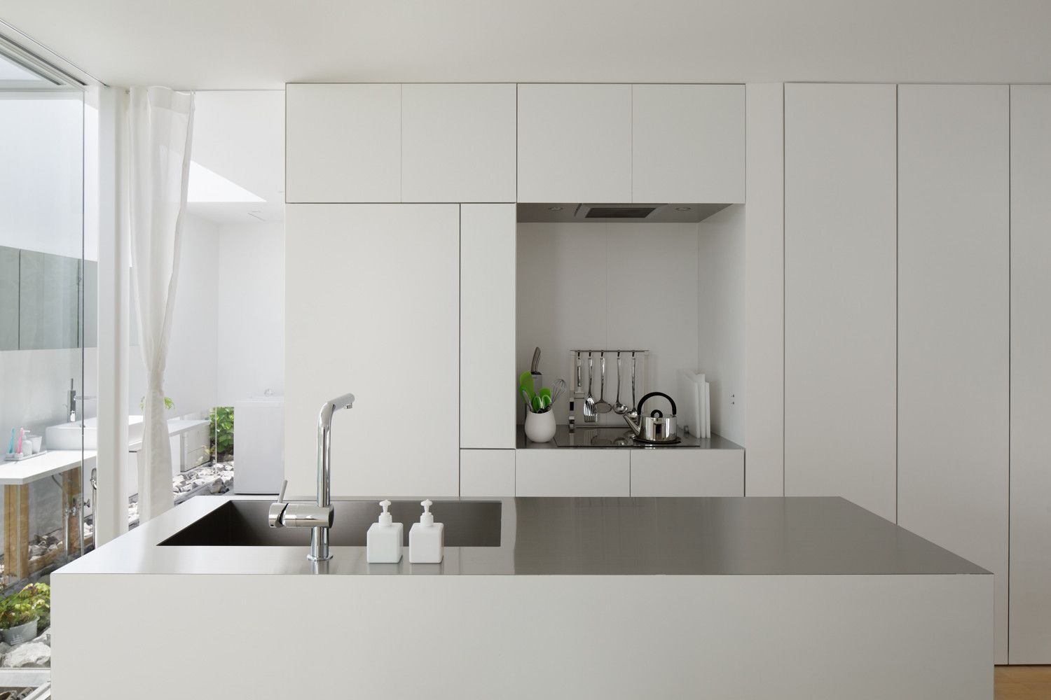 Što se tiče enterijera ove kuće, on je minimalistički – onakav kakav se i očekuje za japansku savremenu arhitekturu. Površine su bele, linije su pročišćene, a napadnih detalja nema.