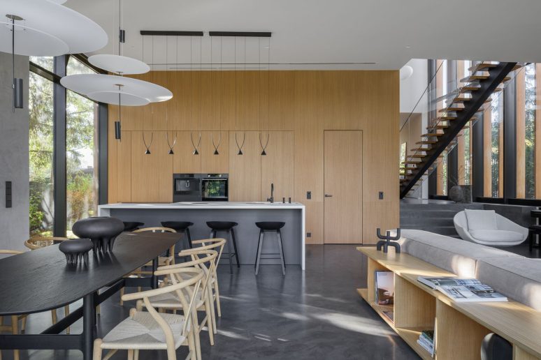 Enterijer dvospratne porodične kuće osmišljen je kao veza čoveka i prirode, s naglaskom na minimalizam, tople materijale i panoramske poglede ka šumi.