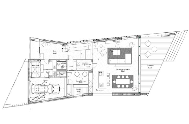 Kako za portal Gradnja objašnjava Ana Sergienko, složena geometrija osnove kuće bila je uzrokovana činjenicom da je na parceli raslo mnogo lepih i velikih stabala i klijenti su želeli da ih sačuvaju.