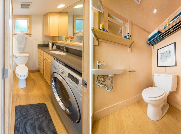 Kupatilo može biti opremljeno kadom ili tuš kabinom, u zavisnosti od odabranog modela. Interesantno je da se ovoj maloj kući na točkovima našlo mesto i za veš mašinu!