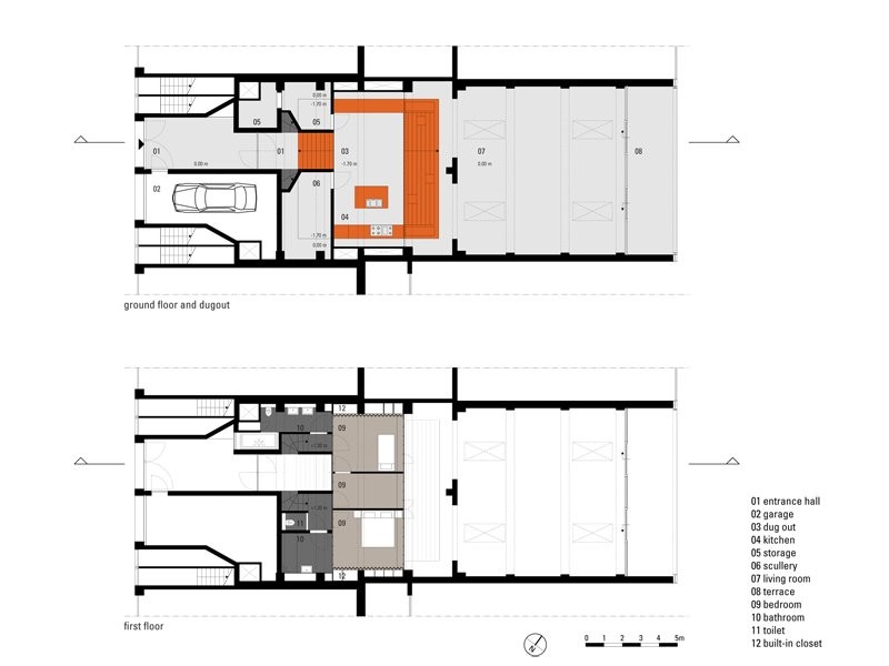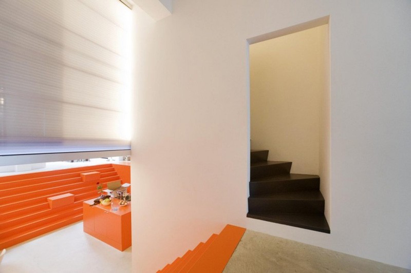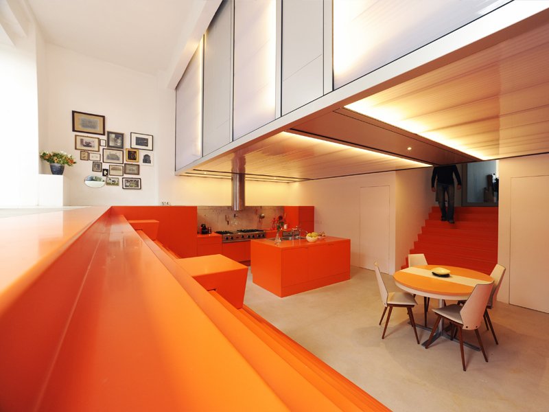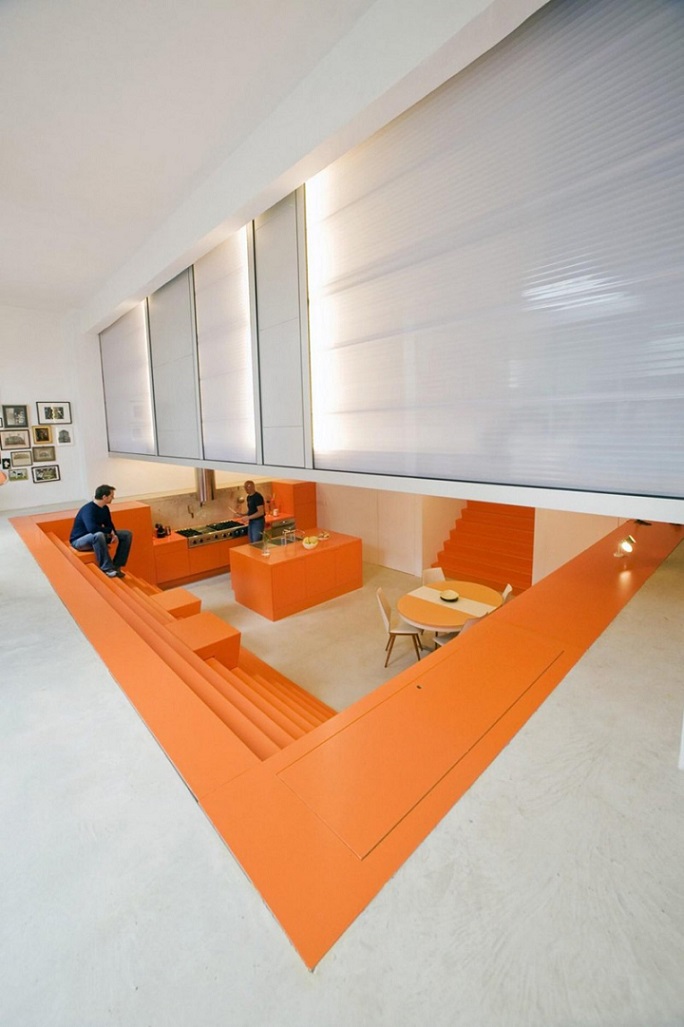 Odlučeno je da centralni deo kuće zauzme prostrana narandžasta kuhinja, preko čijih jednih stepenica se ulazi u kuću, a preko drugih u prostor dnevne sobe.