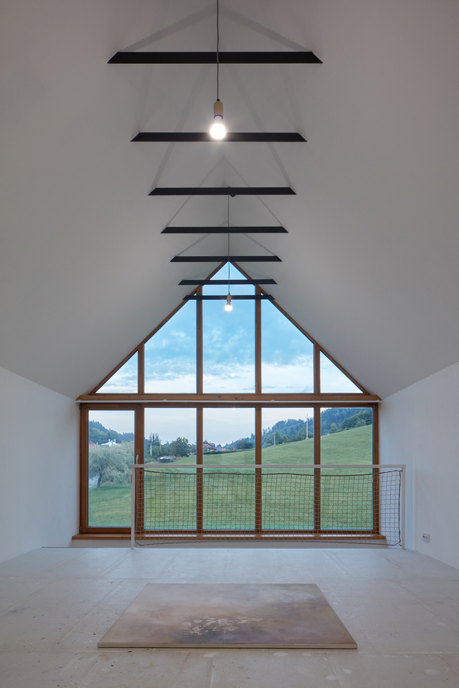 Potkrovlje je podeljeno na pola. Jedan deo pripada ateljeu sa izlazom na zeleni krov, dok je drugi u potpunosti pod dominacijom dece, koja kroz stakleni zabat imaju pogled na okolna brda.
