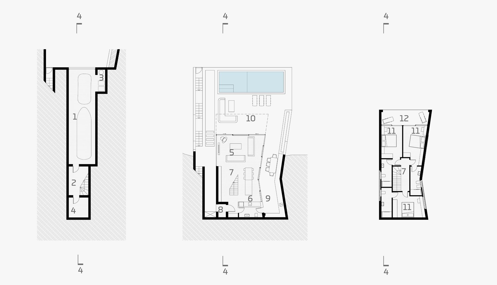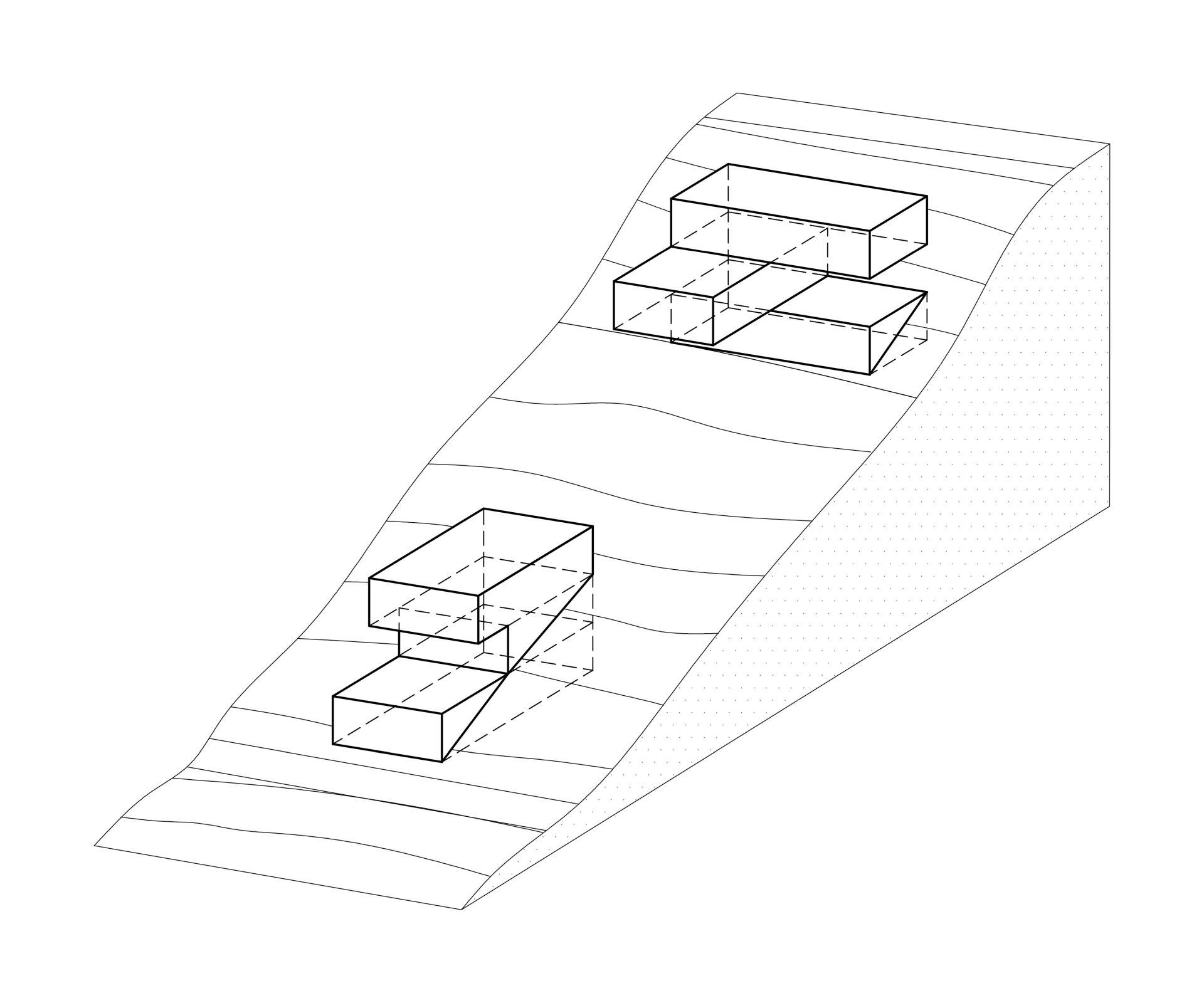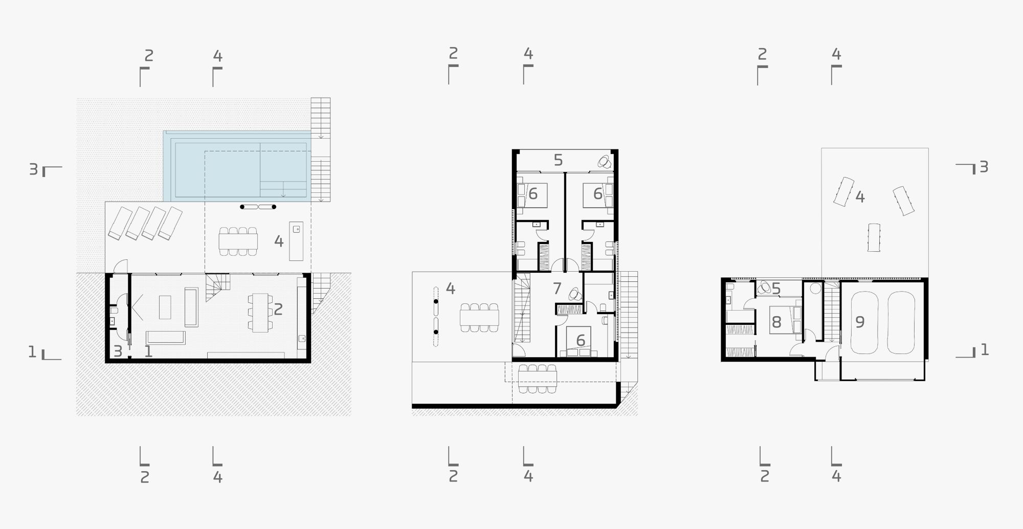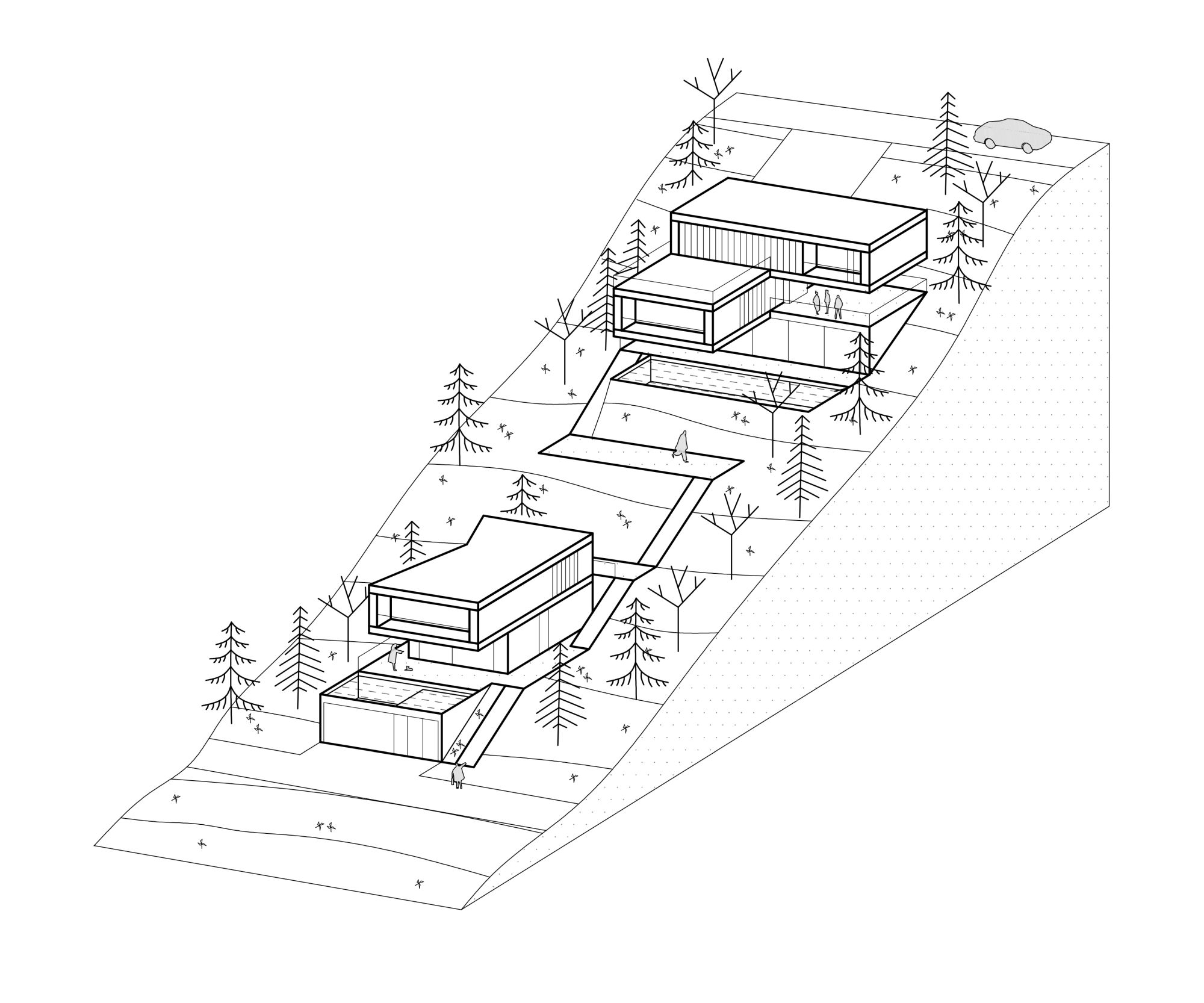 Relativno veliki volumeni kuća u odnosu na veličinu parcele usitnjeni su u tri približno jednaka kubusa, po kući postavljena tako da svojim međuodnosima stvaraju raznolike spoljašnje prostore prijatne za boravak.