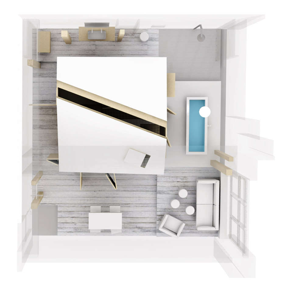 Arhitekta je transformisao sobu tako što je u njoj napravio i spoljanji i unutrašnji prostor. Od špera je kreirana kućica sa sobom, kuhinjom i saunom, dok su ostali prostor tretirani kao vrt u kom su dodatni sadržaji, piše Dezeen.