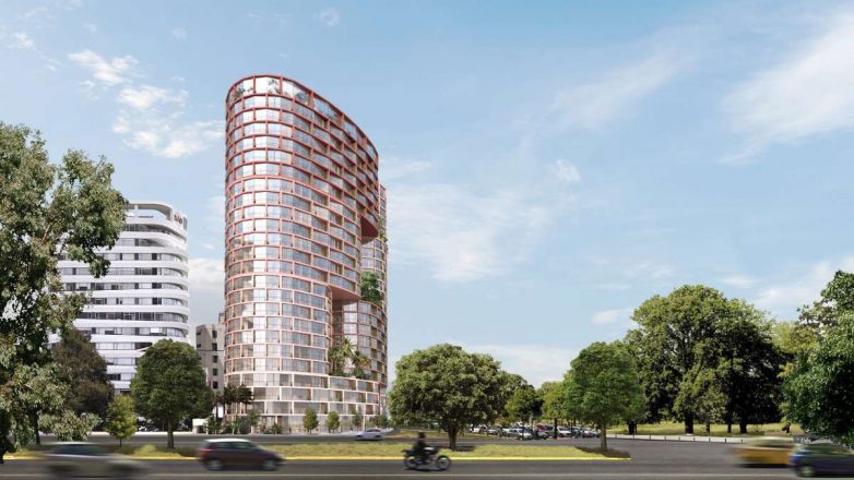 Riblja kost na crvenoj fasadi novog vertikalnog grada