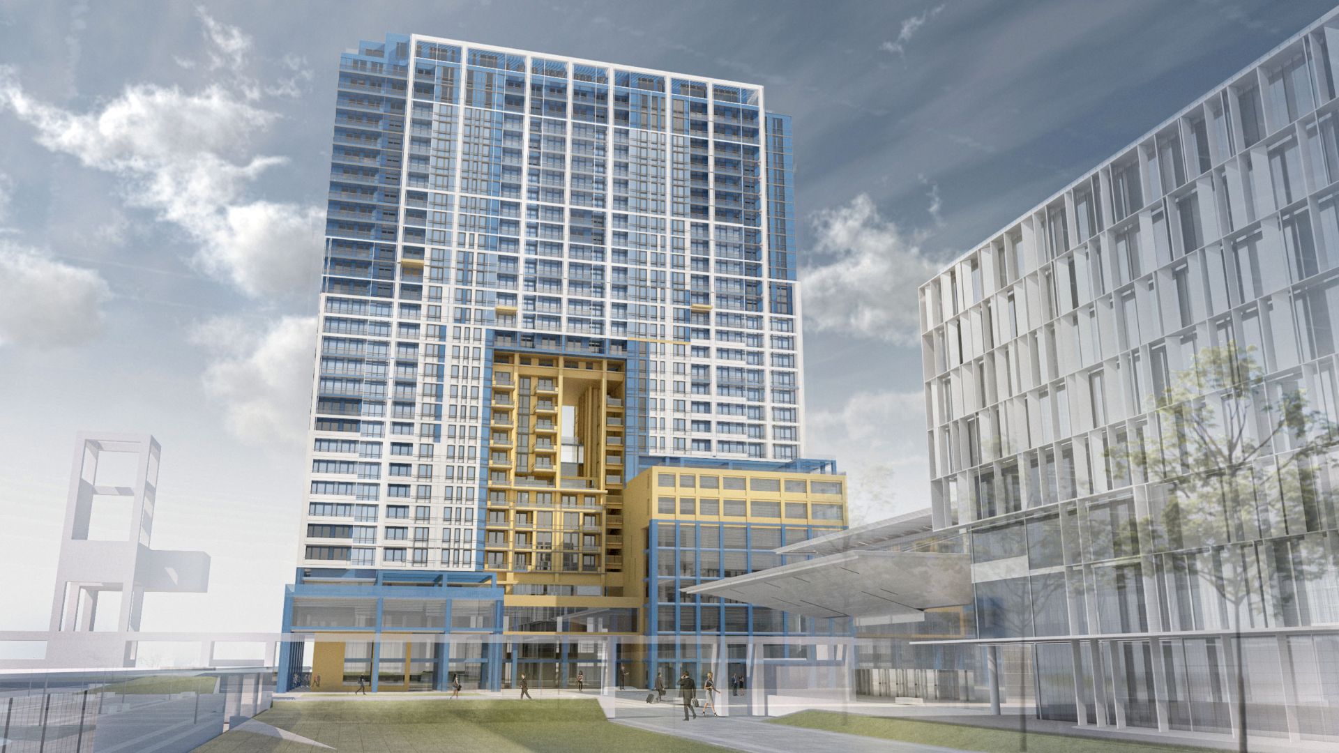 Viši bazis je u zaleđu trga, nastavlja visinsku regulaciju postojećeg objekta NCR, a zajedno su vizuelni odgovor na izražen uticaj linearnosti konstrukcije železničkog mosta u zaleđu.
