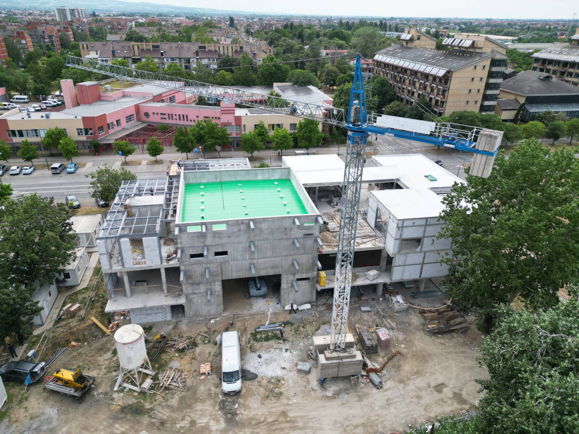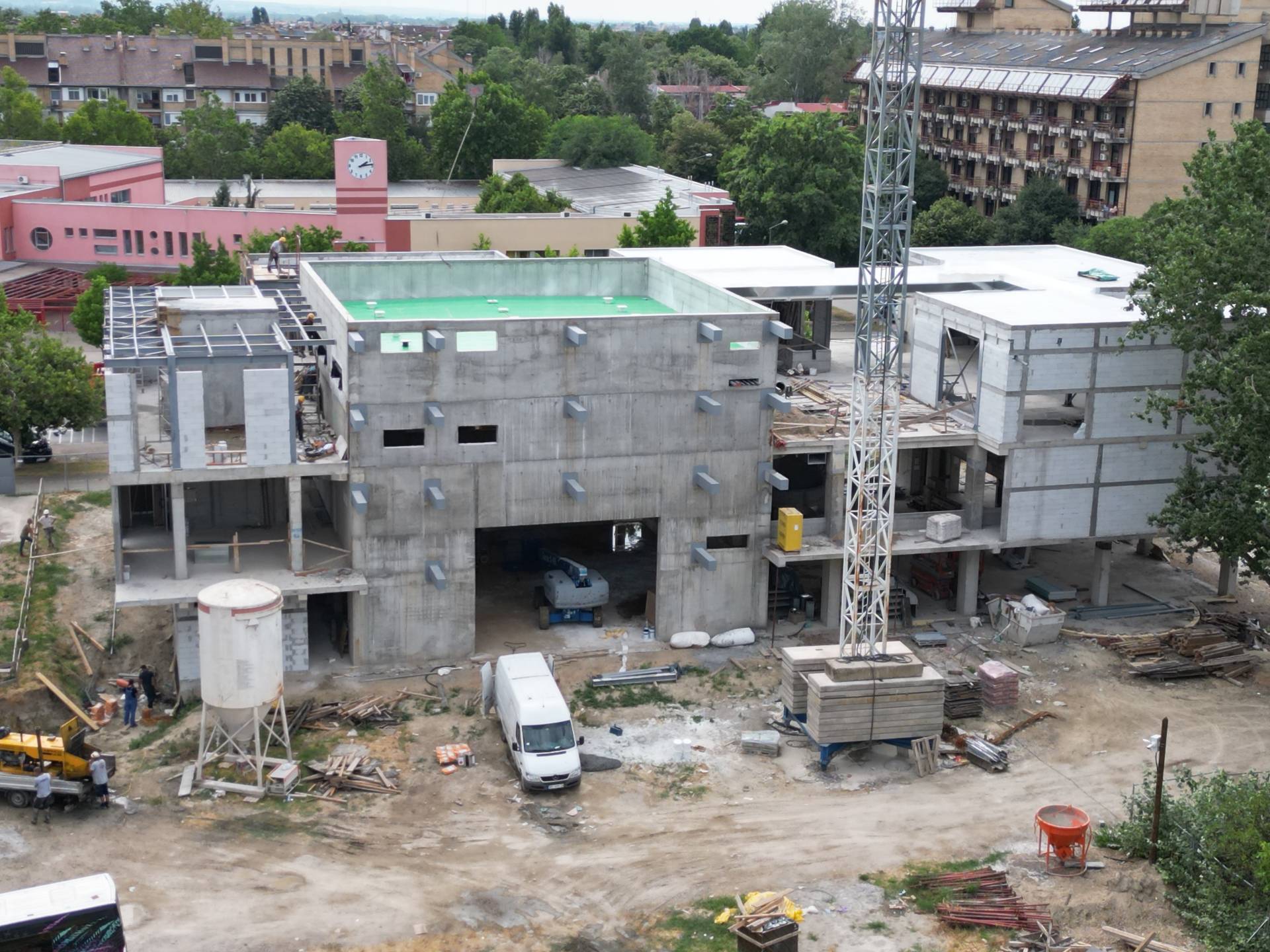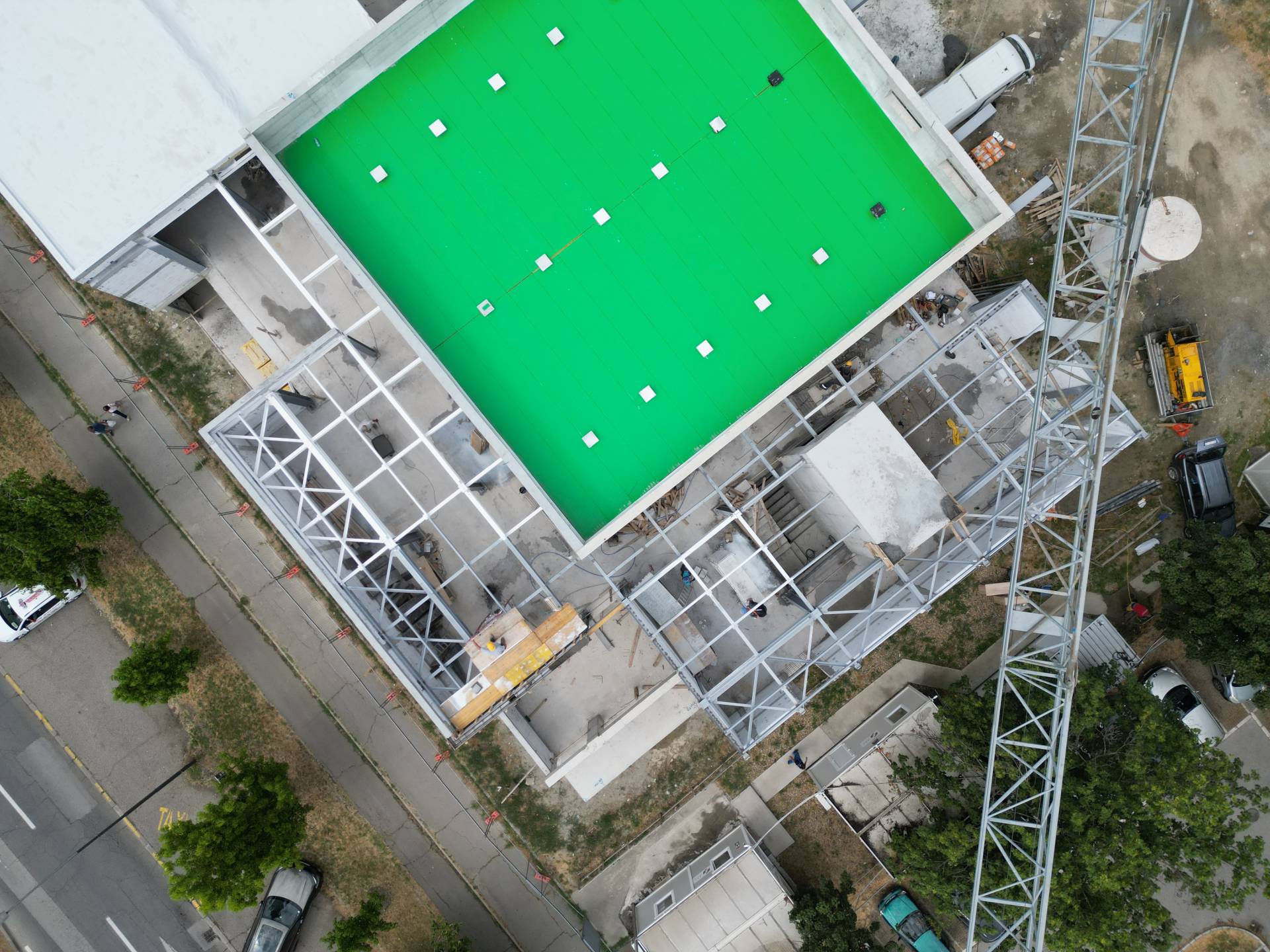 Na dron snimku vidi se i atika sa zelenom bojom na podu, u kojoj će se smeštati mašinska oprema, dok su prema projektu u podrumskoj etaži smeštene tehničke prostorije i garaža.