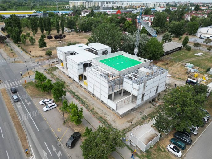 Gradilište snimljeno iz vazduha otkriva kako nova kulturna stanica u Novom Sadu dobija svoj prepoznatljiv oblik.