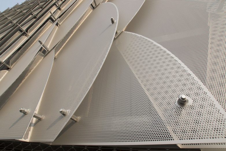 Laserski sečeni paneli od perforiranog metala su montirani ručno na čeličnu potkonstrukciju.